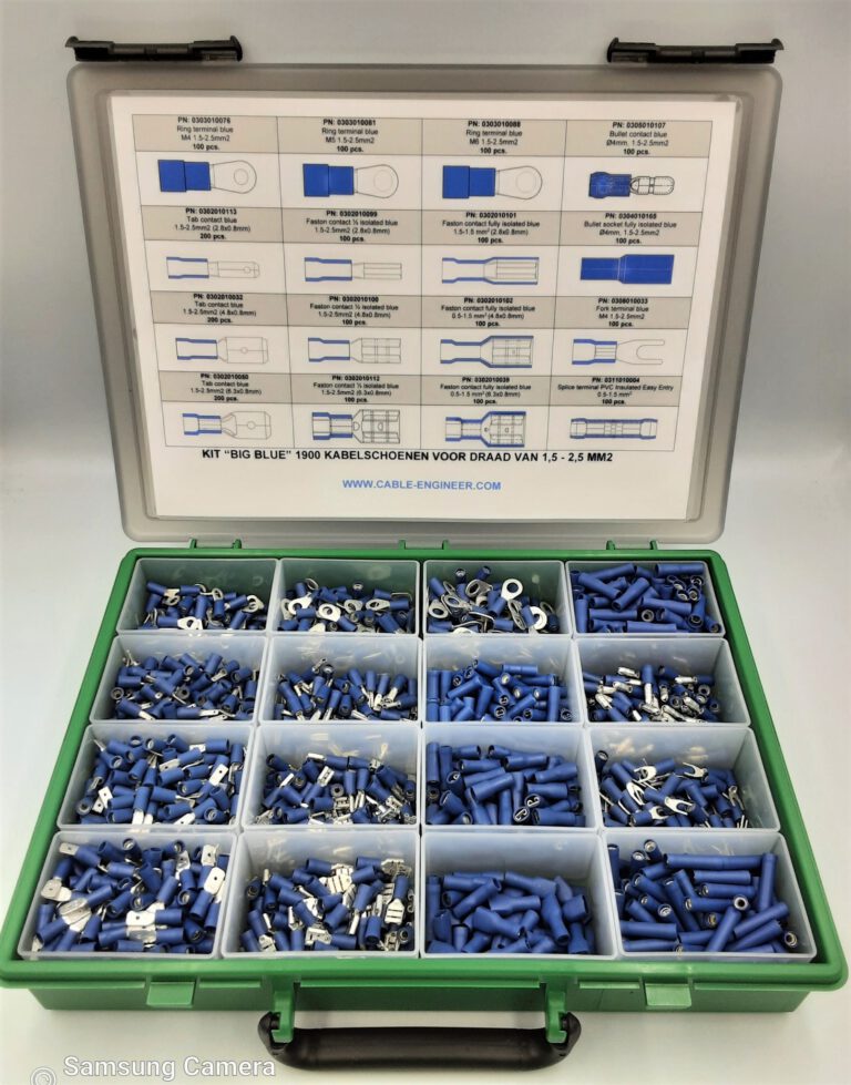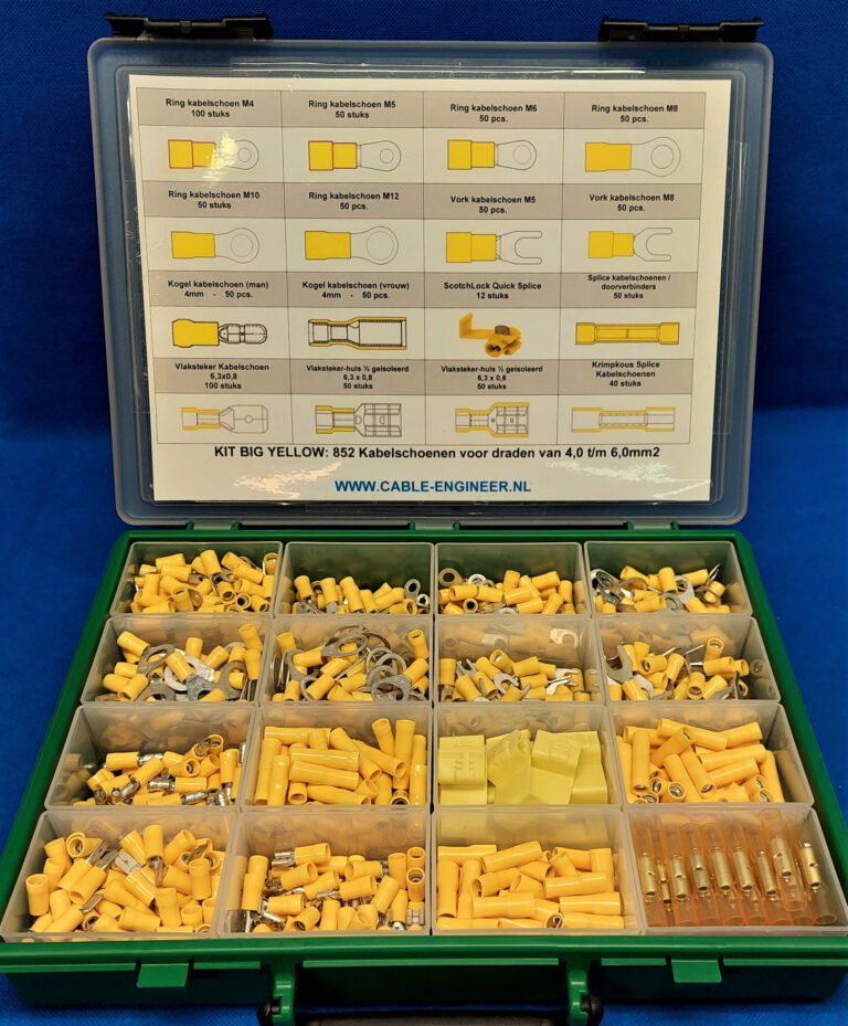 Groot programma aan verschillende assortimentsdozen met kabelschoenen, adereindhulzen, connectoren en met of zonder gereedschap. Vele maten en soorten uit voorraad leverbaar.