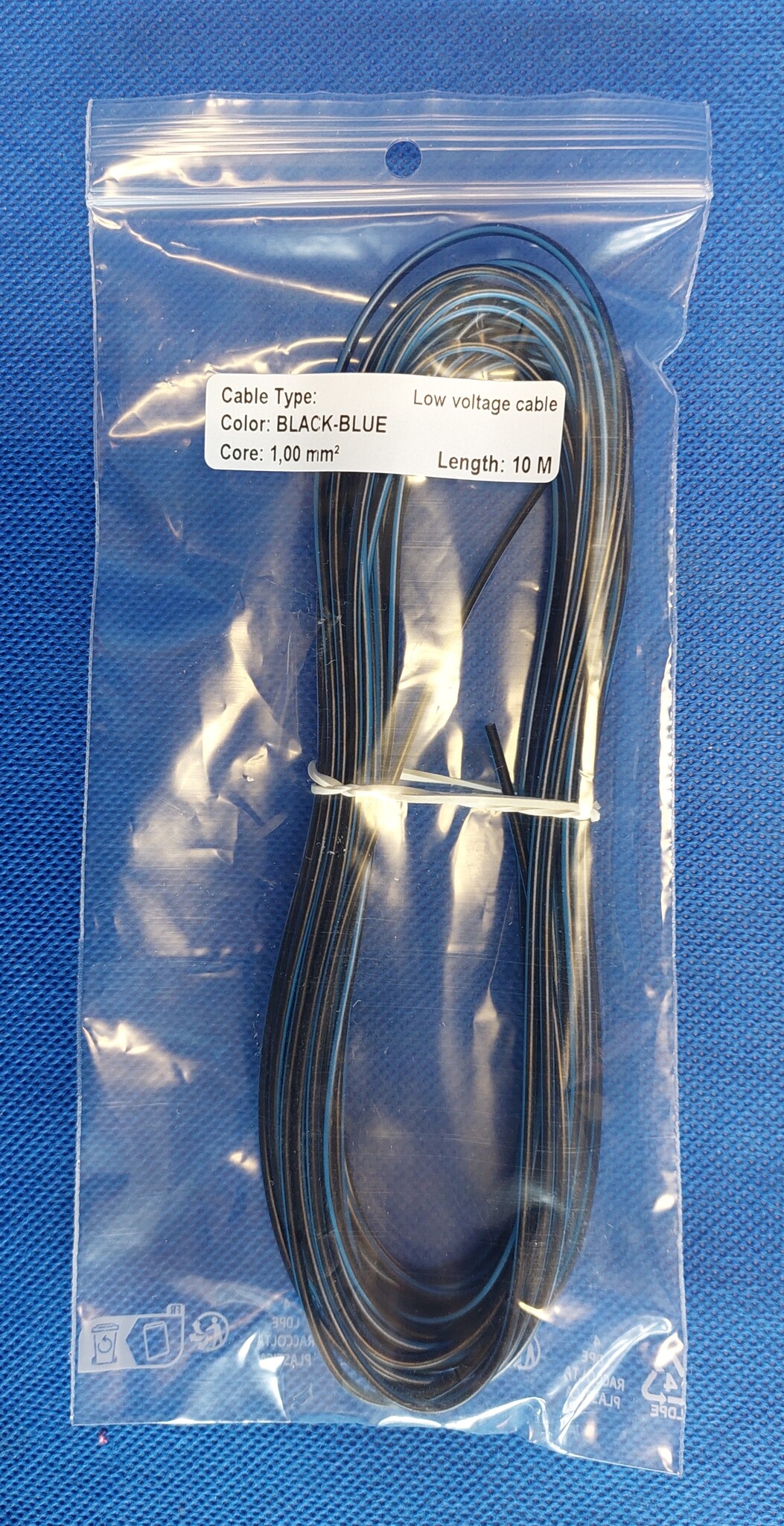 10 meter hand gerold in afsluitbare plastic zak met vermelding van product nummer, afmeting, kleur en type van de kabel