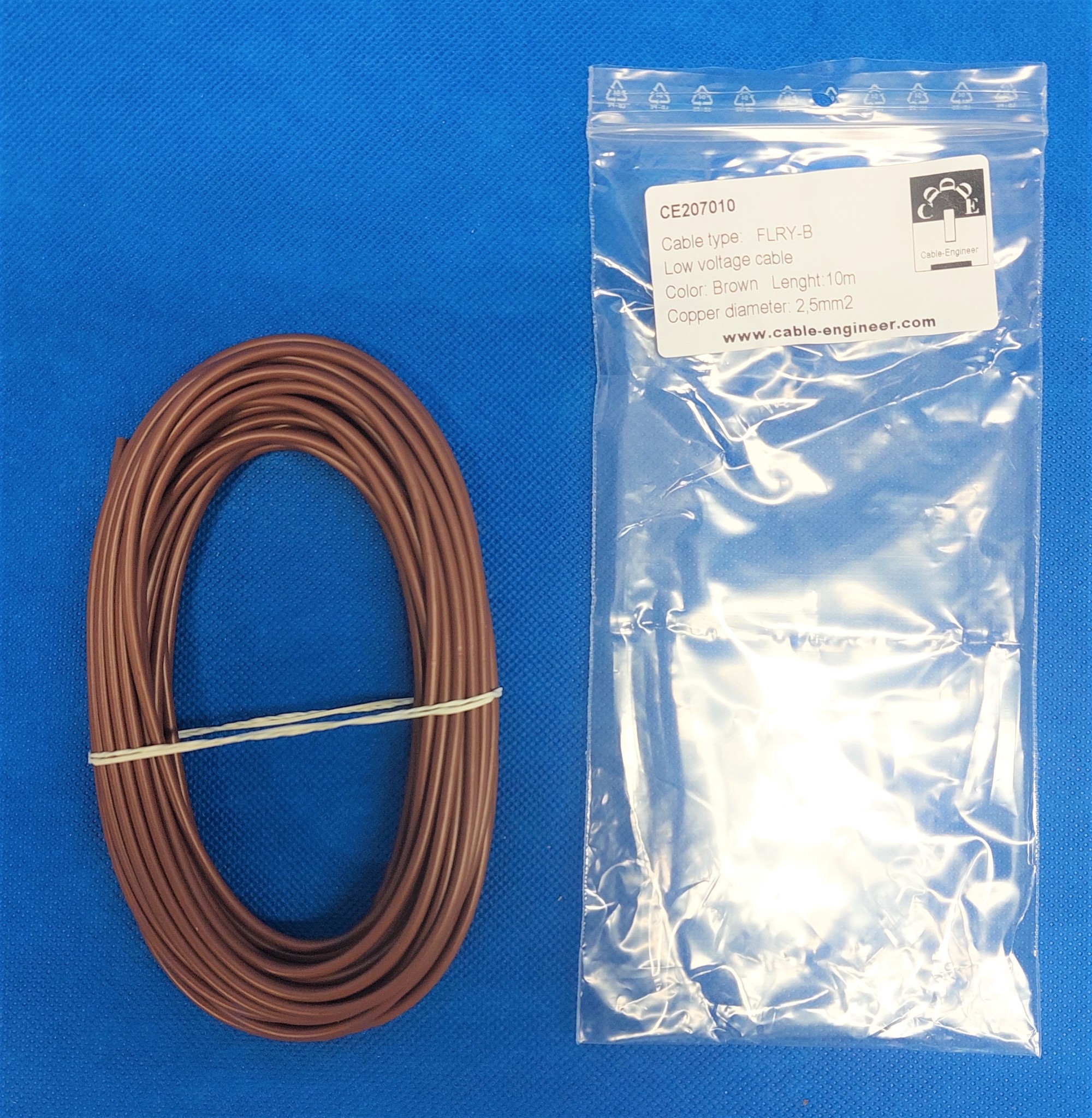 De code FLRY-B staat voor: FL = Automotive kabel R= Gereduceerde dikte van de isolatie Y= Isolatie van PVC B= asymmetrisch gebundelde geleiders (dunne koperen draden). 2,5mm2 FLRY-B kabel bestaat uit 50 asymmetrisch gebundelde koperen draden wat zorgt voor een extra hoge flexibiliteit en optimale geleiding.
