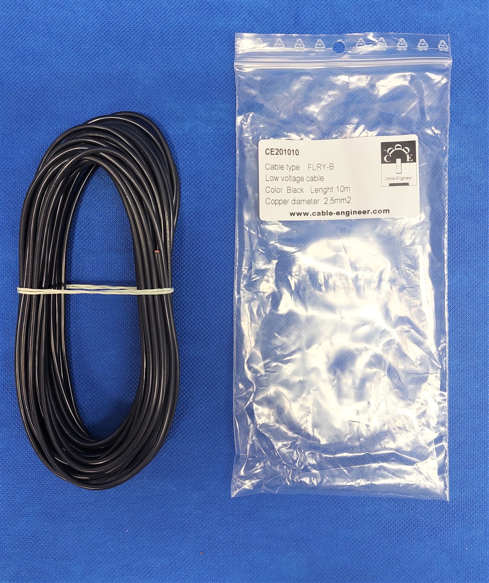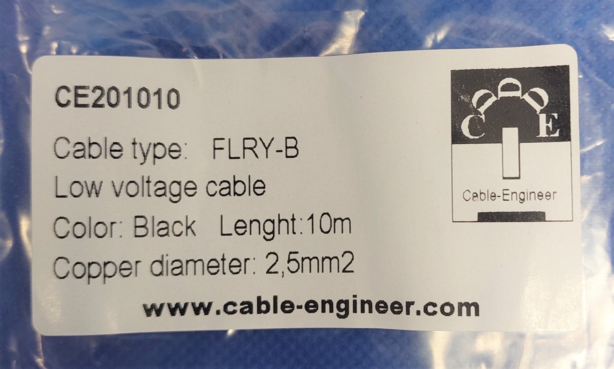 De code FLRY-B staat voor: FL = Automotive kabel R= Gereduceerde dikte van de isolatie Y= Isolatie van PVC B= asymmetrisch gebundelde geleiders (dunne koperen draden). 2,5mm2 FLRY-B kabel bestaat uit 50 asymmetrisch gebundelde koperen draden wat zorgt voor een extra hoge flexibiliteit en optimale geleiding.