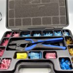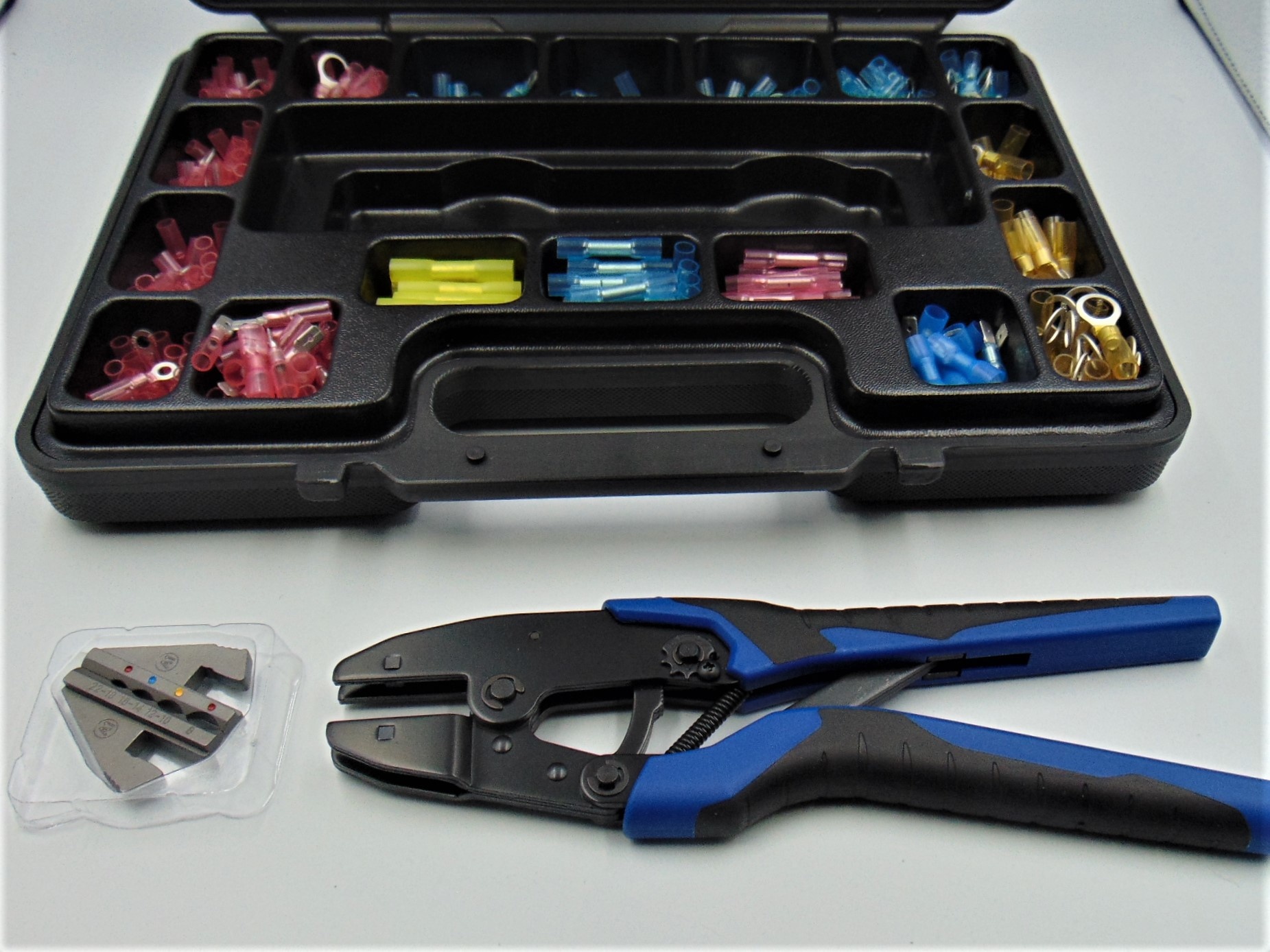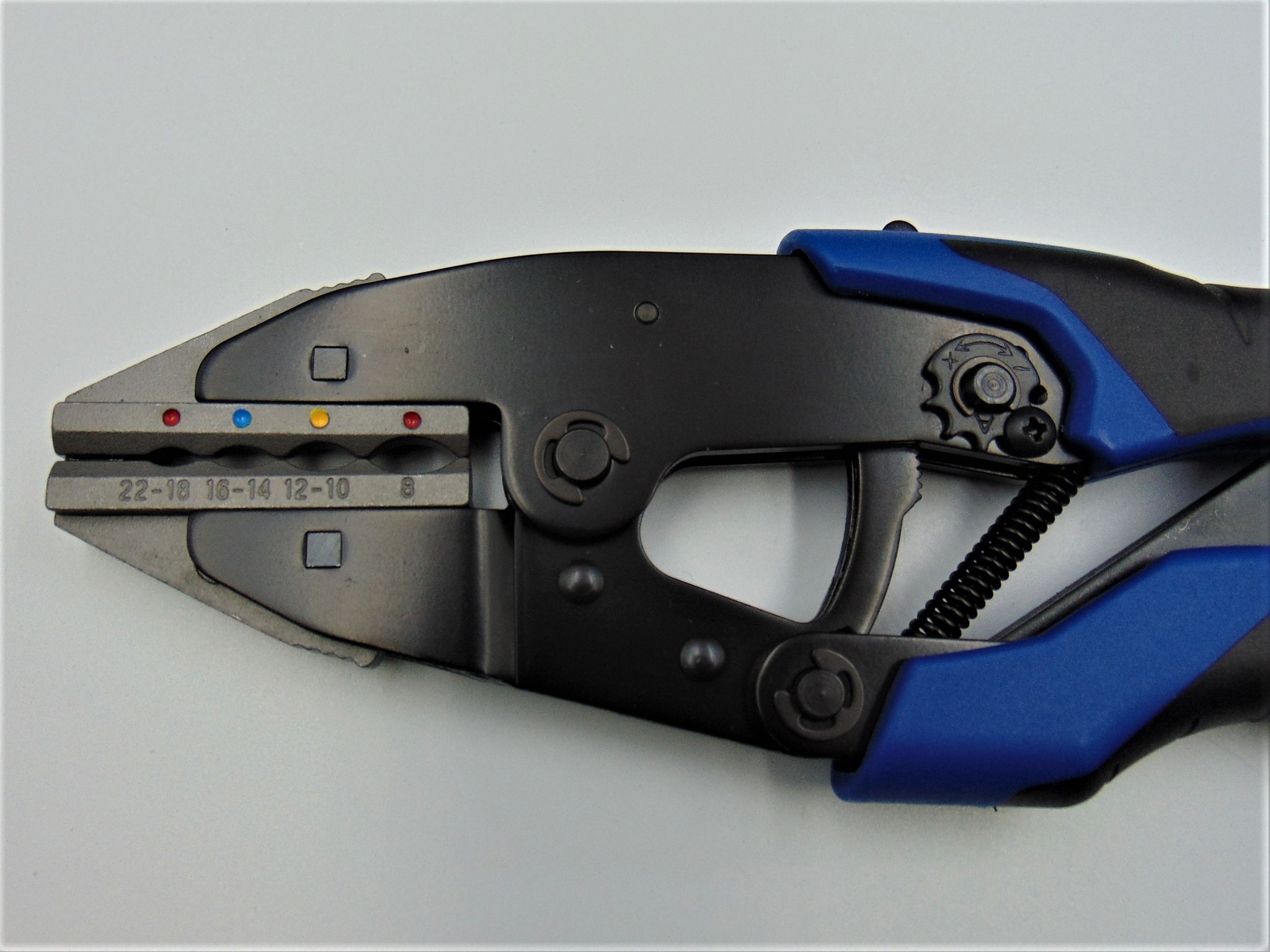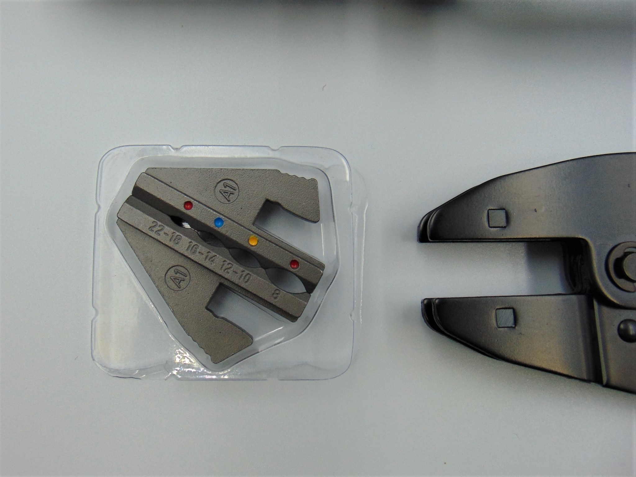 De tang wordt geleverd met 2 profiel-sets of die-sets; 1 voor de wat plattere splices en doorverbinders, de andere set is voor het krimpen van de vlakstekers.