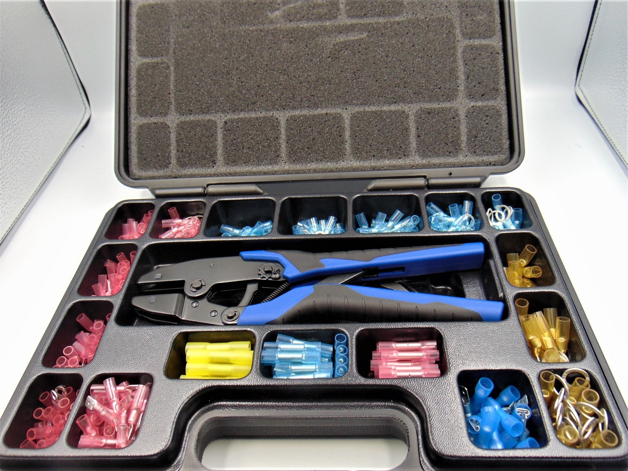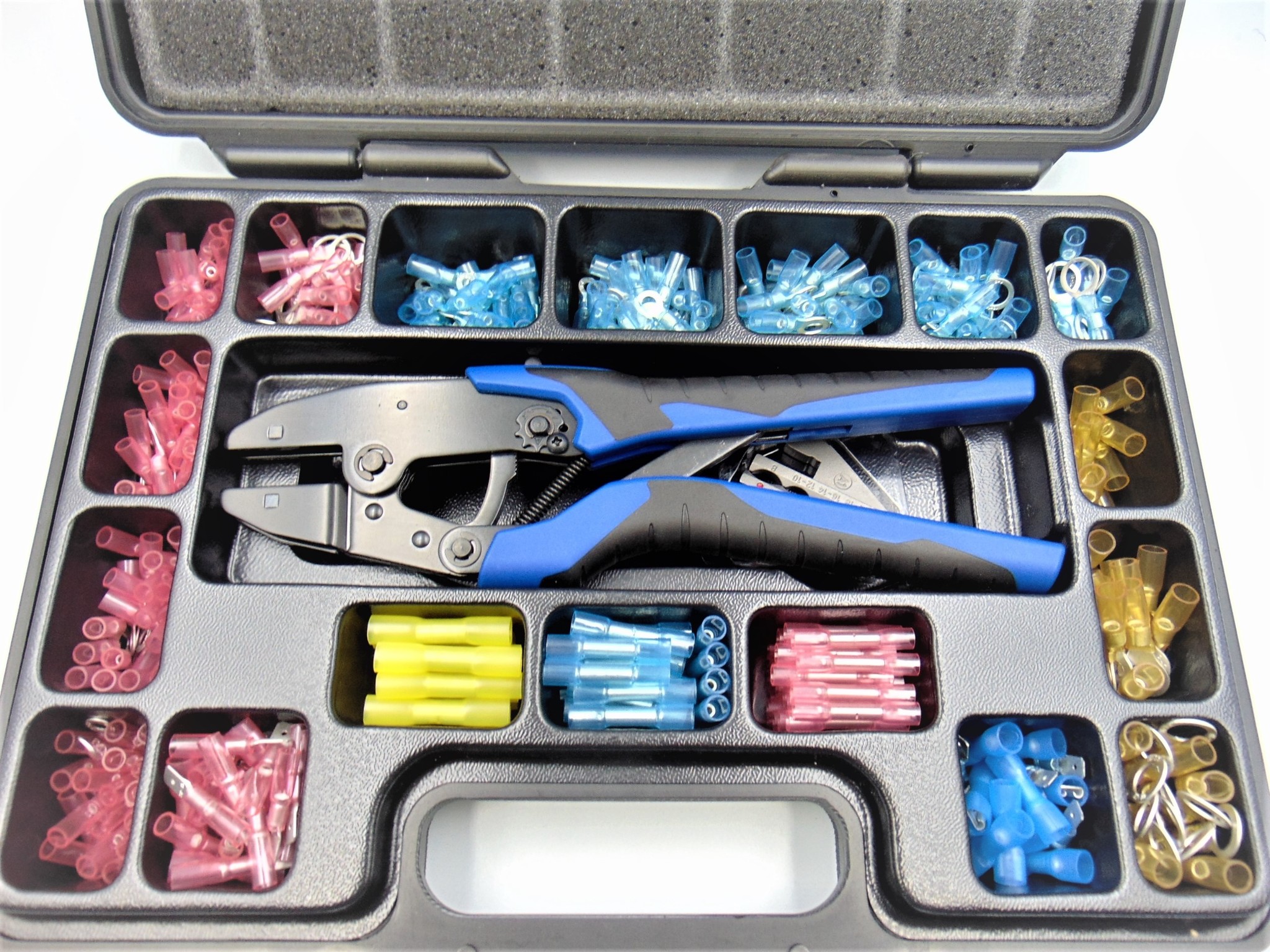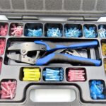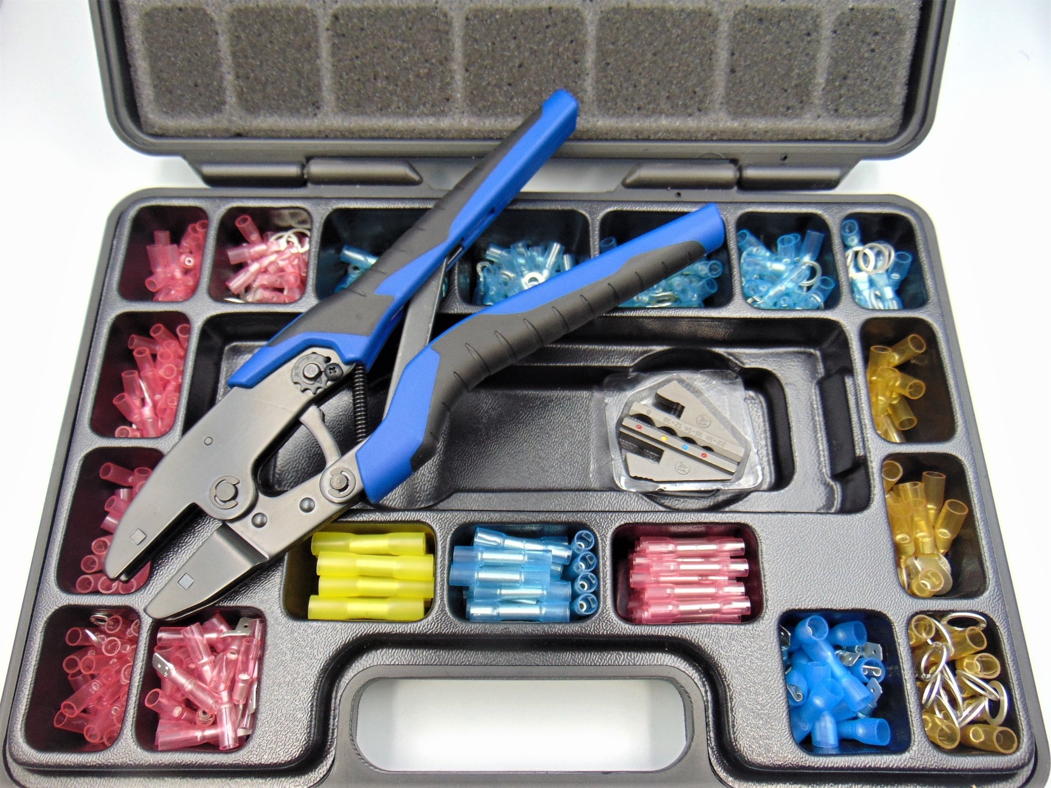 De tang wordt geleverd met 2 profiel-sets of die-sets; 1 voor de wat plattere splices en doorverbinders, de andere set is voor het krimpen van de vlakstekers.