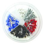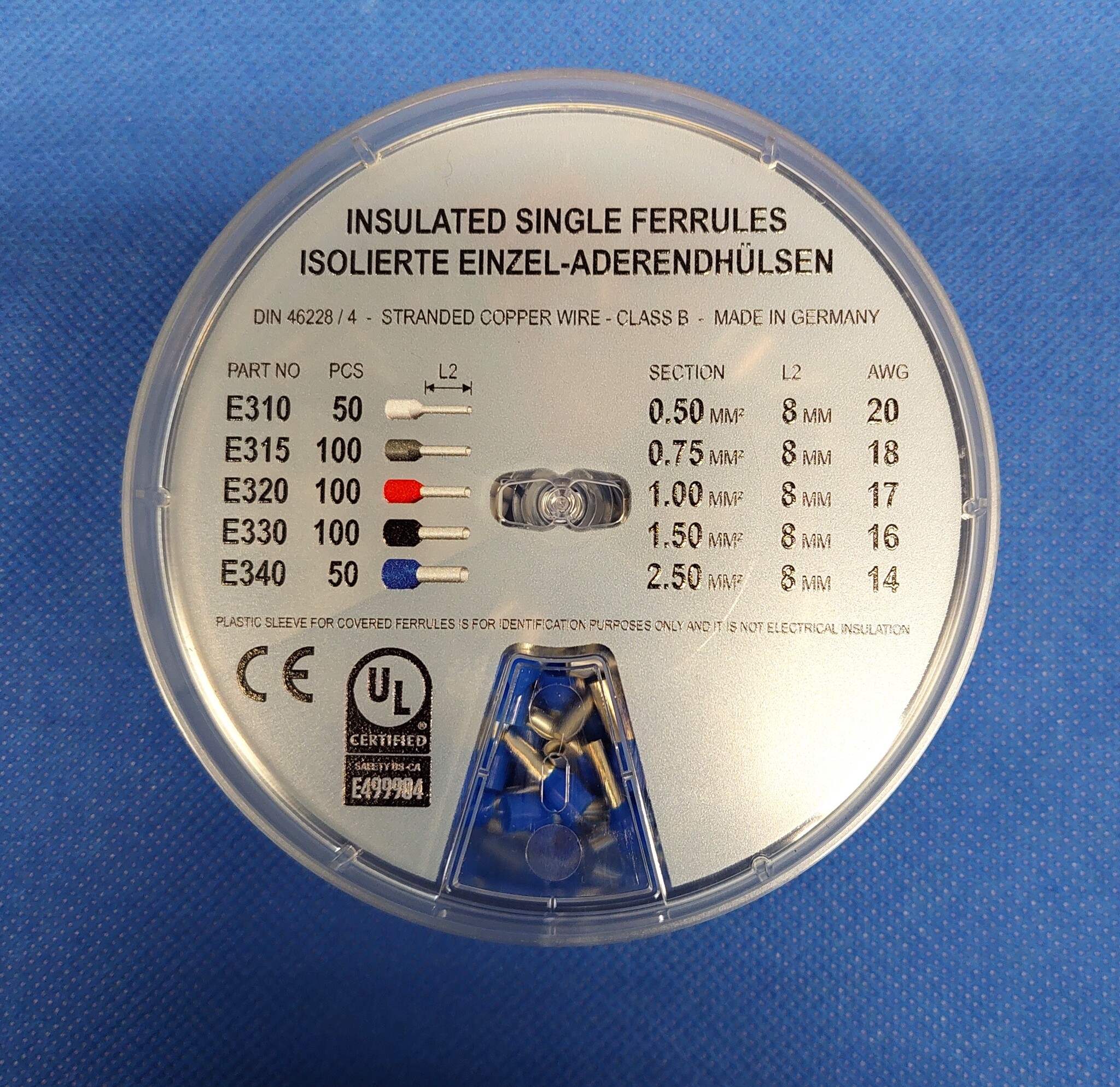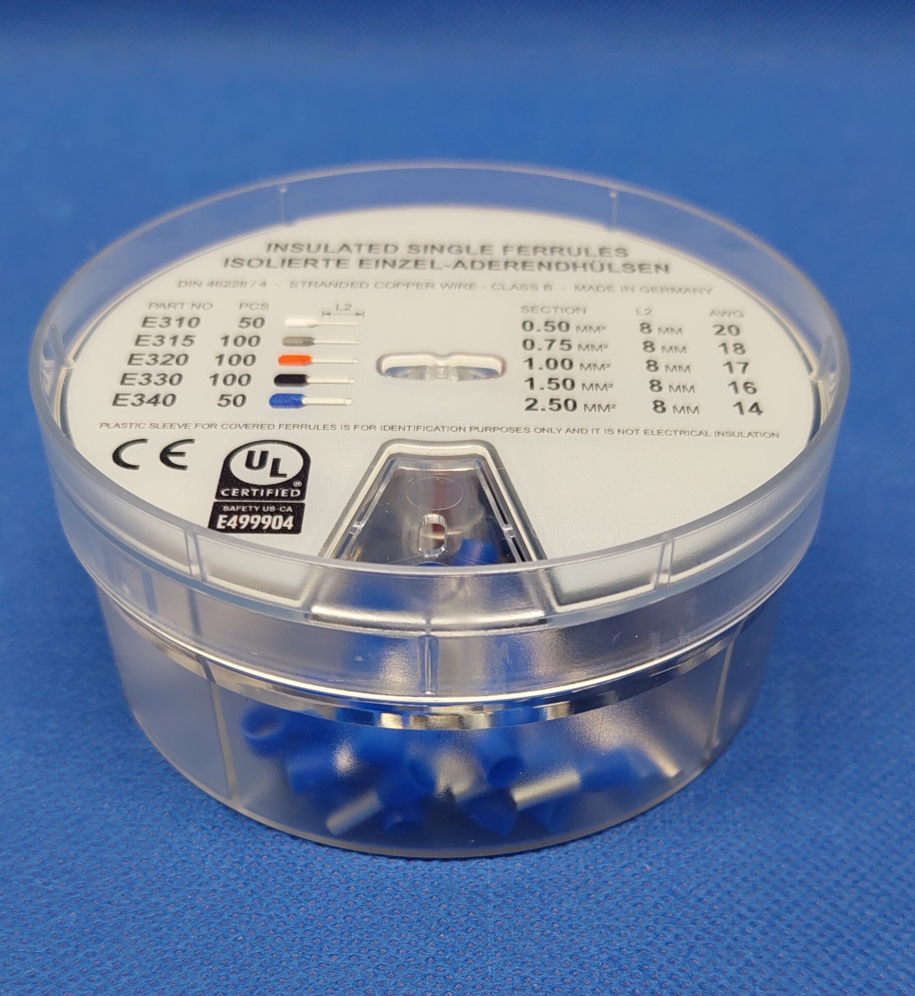 Handige opbergdoosje met 400 professionele adereindhulzen met kunststof kraag (geïsoleerd). CE en UL gecertificeerd. DIN 46228 / 4