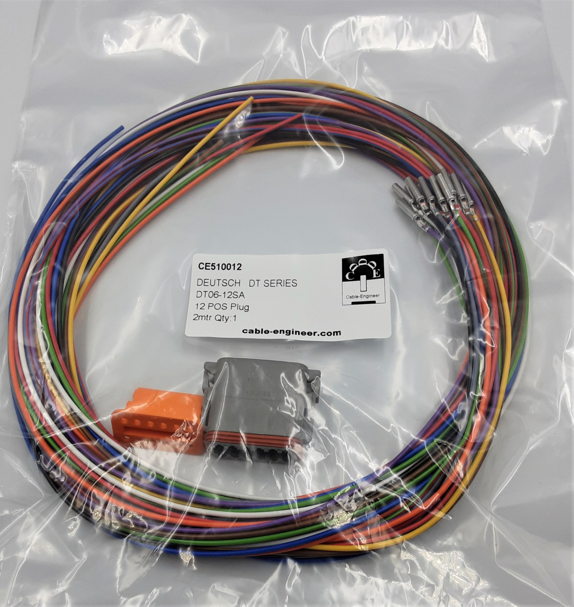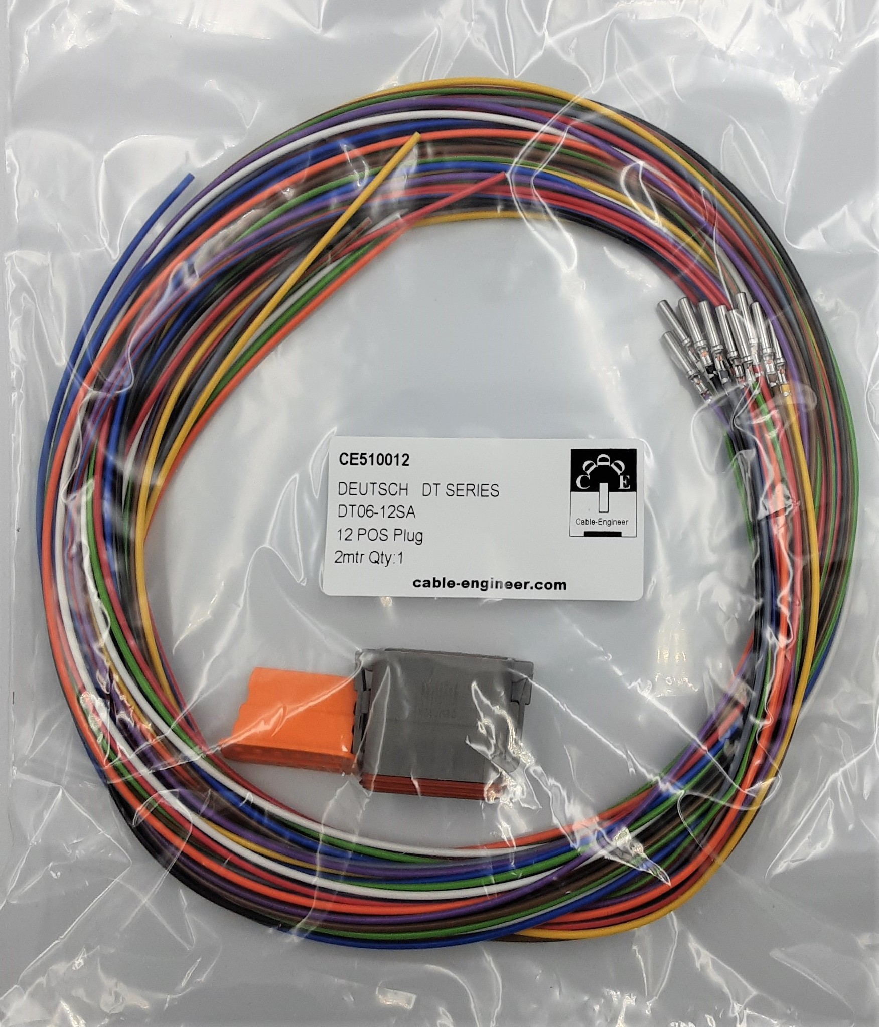 Complete Deutsch DT Pigtail-set met Deutsch DT 12-Pos. Plug (man)+ 12x 2 meter 0,75mm2 FLRY-B kabel in de kleuren Rood, Zwart, Bruin, Blauw, Groen, Geel, Wit, Oranje, Grijs, Paars, Geel-Groen en Rood-Groen met professioneel aangekrompen contacten en bijbehorende wedgelock voor het vastzetten en exact uitlijnen van de contacten in de behuizing.