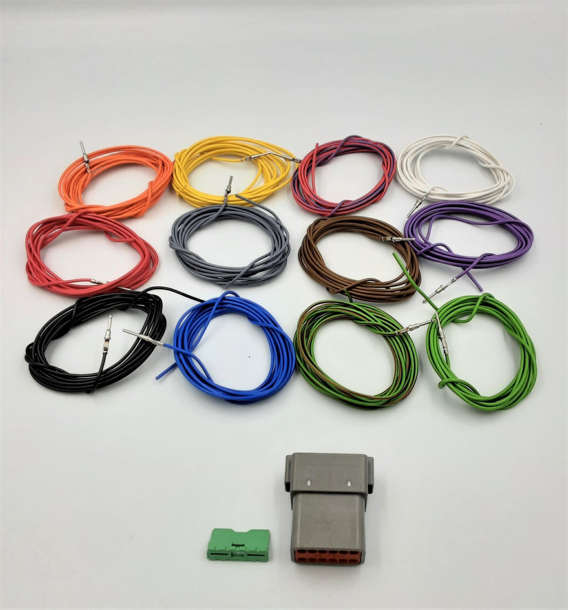 Complete Deutsch DT Pigtail-set met Deutsch DT 12-Pos. Receptacle (vrouw) connector en 12x 2 meter 0,75 mm2 FLRY-B kabel in de kleuren Rood, Zwart, Bruin, Blauw, Groen, Geel, Wit, Oranje, Grijs, Paars, Geel-Groen en Rood-Groen met professioneel aangekrompen contacten en bijbehorende wedgelock voor het vastzetten en exact uitlijnen van de contacten in de behuizing.