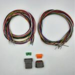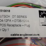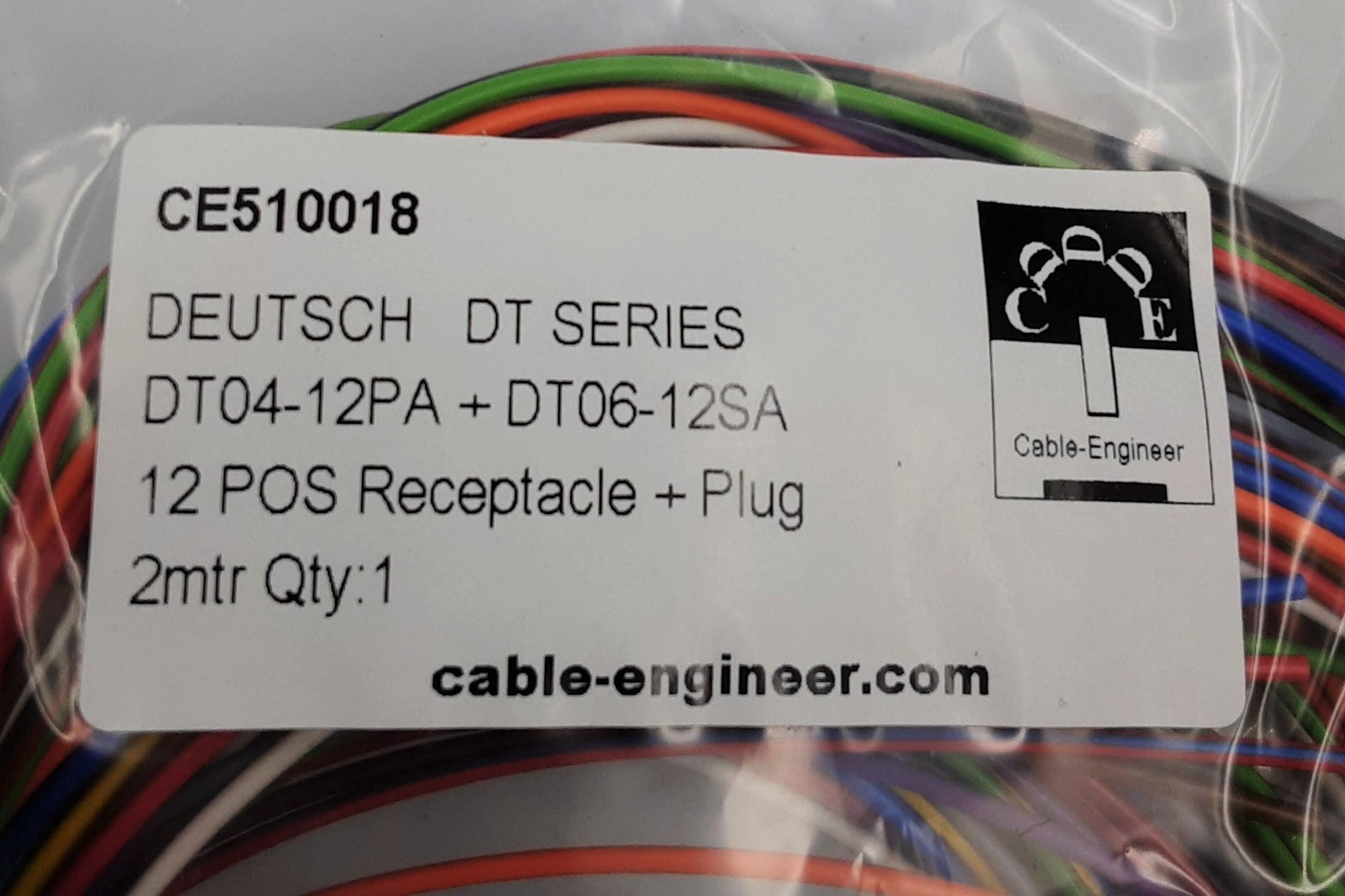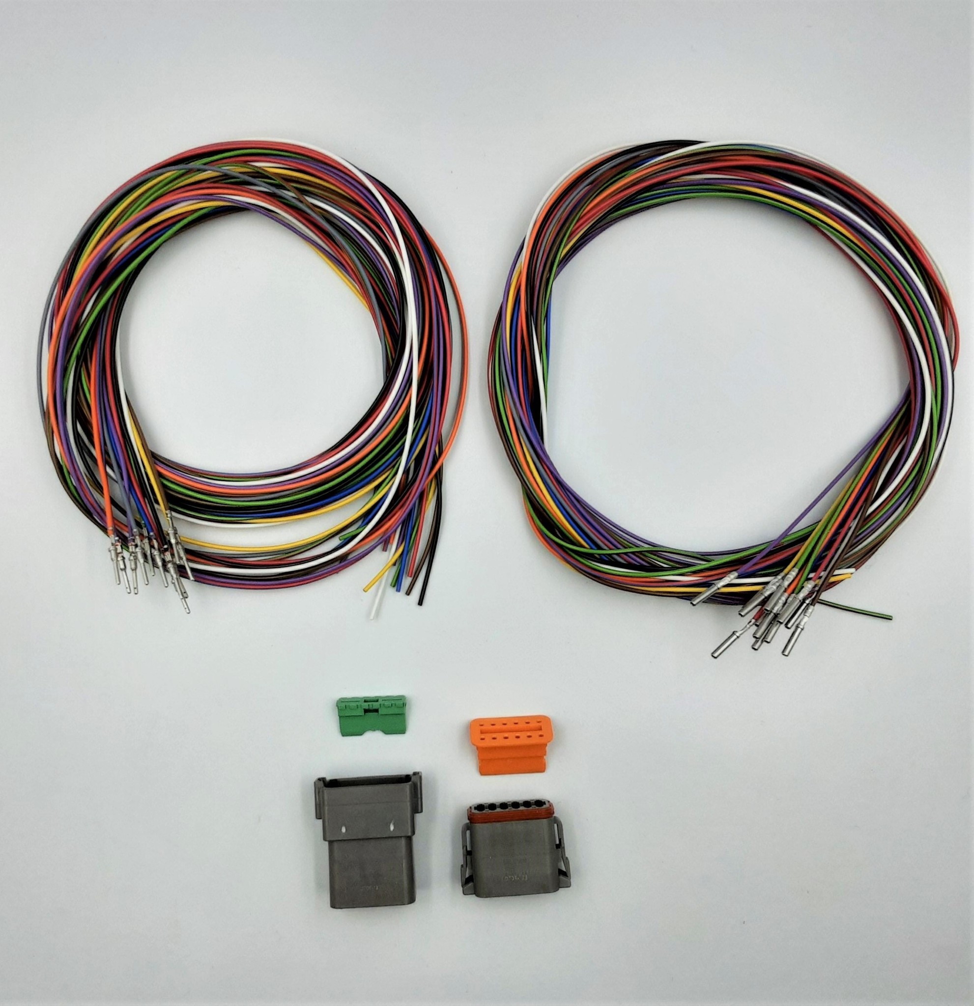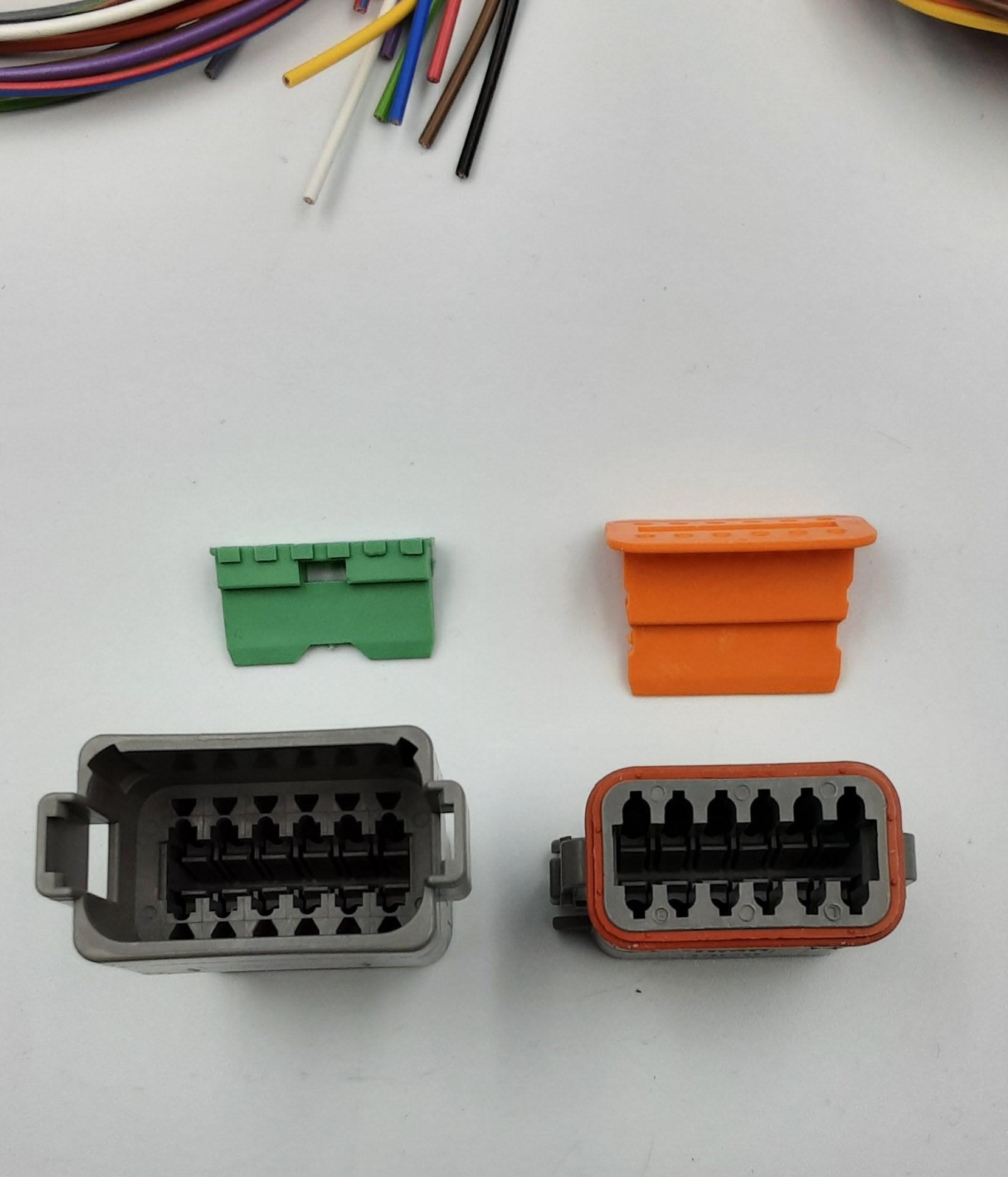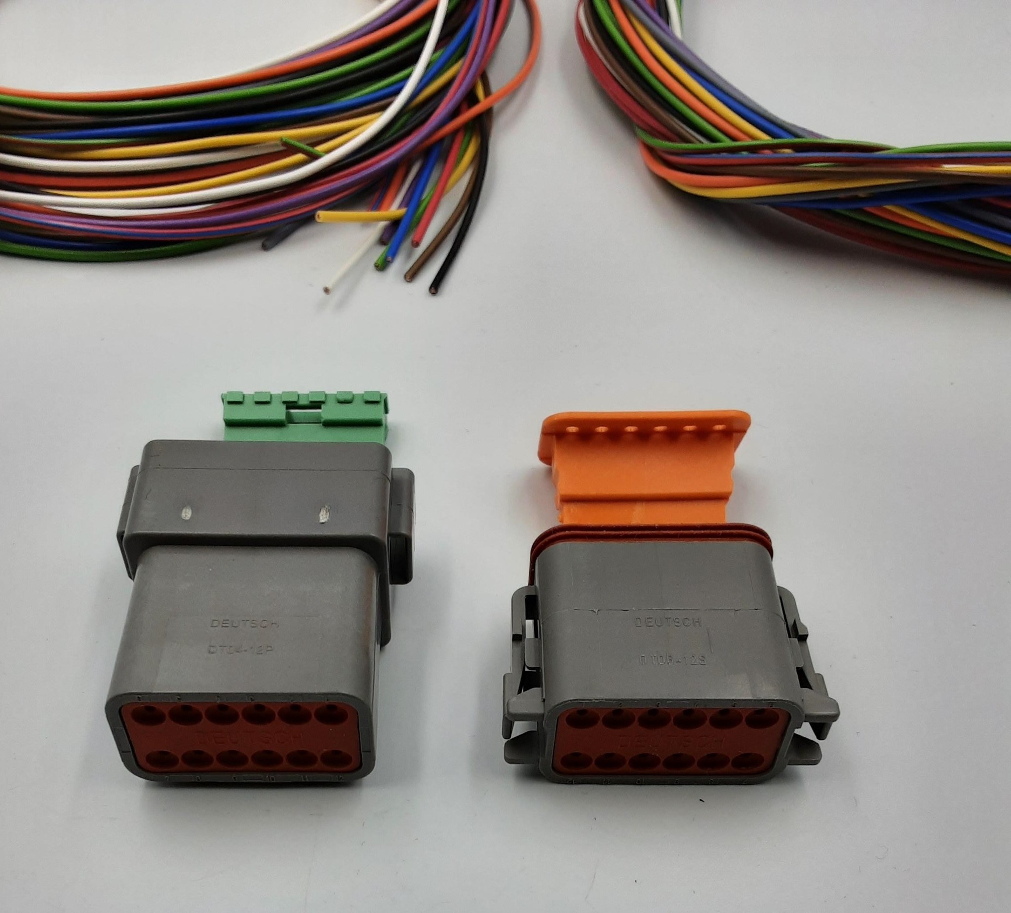 Complete Deutsch DT Pigtail-set met Deutsch DT 12-Pos. Receptacle & Plug + 24x 2 meter FLRY-B kabel in de kleuren Rood, Zwart, Bruin, Blauw, Geel, Grijs, Groen, Oranje, Paars, Wit, Groen-Geel en Rood-Groen met professioneel aangekrompen contacten en bijbehorende wedgelock voor het vastzetten en exact uitlijnen van de contacten in de behuizing.