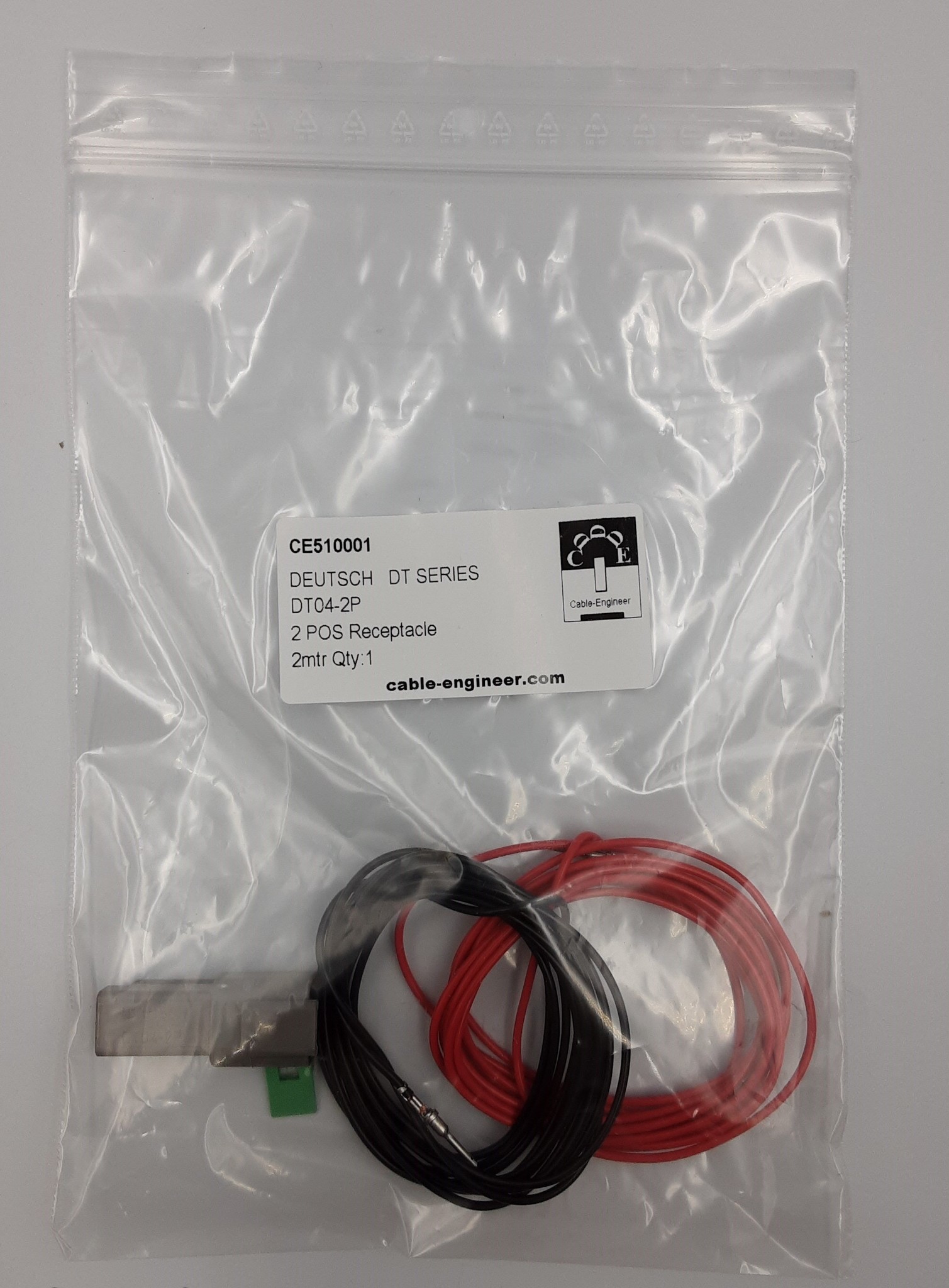 Complete Deutsch DT Pigtail-set met Deutsch DT 2-Pos. Receptacle DT04-2P (vrouw) connector + 2x 2 meter FLRY-B kabel 0,75mm2 in de kleuren Rood en Zwart met professioneel aangekrompen contacten en bijbehorende wedgelock voor het vastzetten en exact uitlijnen van de contacten in de behuizing.