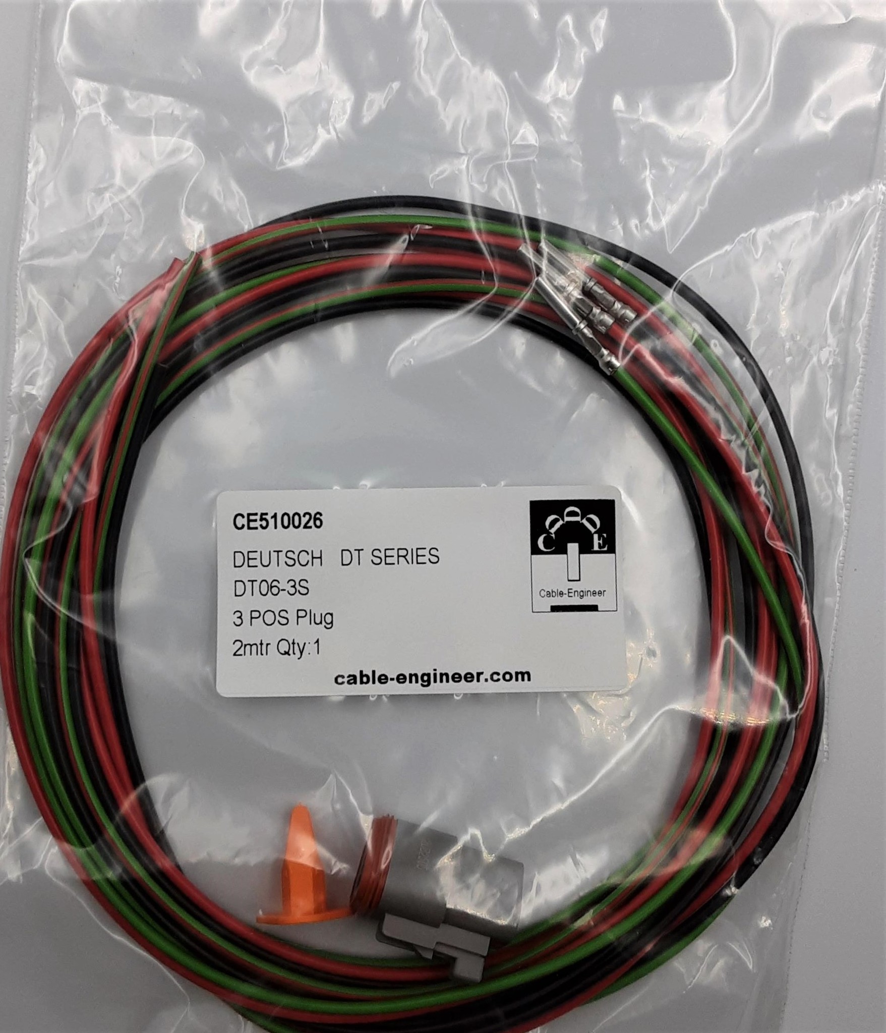 Complete Plug set met één Deutsch DT 3Pos. Plug (man), 3x 2 meter 1,5mm2 FLRY-B kabel in de kleuren rood, zwart en rood/groen met professioneel aangekrompen vrouwelijke contacten en bijbehorende wedgelock voor het vastzetten en exact uitlijnen van de contacten in de behuizing.