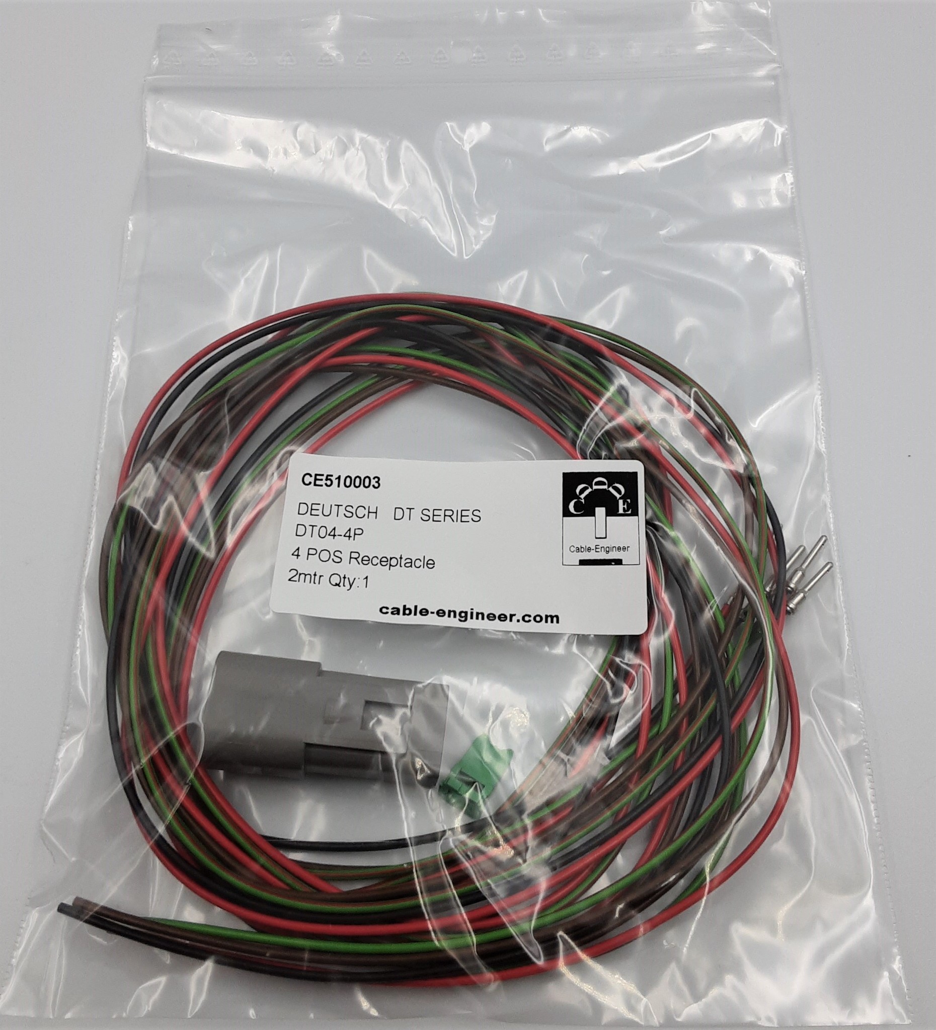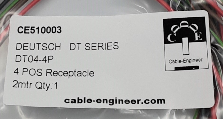 Complete Receptacle set met één Deutsch DT 4-Pos. Receptacle connector, 4x 2 meter FLRY-B kabel in de kleuren zwart, rood ,bruin en groen/rood met professioneel aangekrompen mannelijke contacten (nikkel) en bijbehorende wedgelock voor het vastzetten en exact uitlijnen van de contacten in de behuizing.