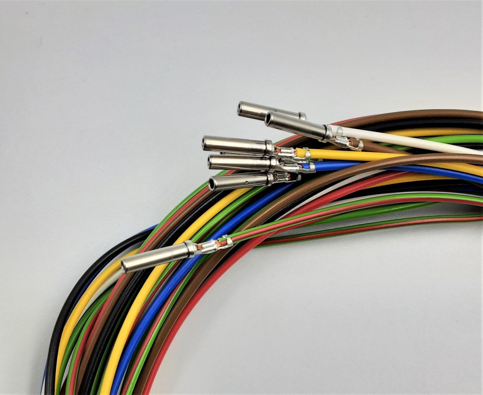 Complete Plug set met Deutsch DT 8-Pos. Receptacle & Plug + 16x 2 meter FLRY-B kabel in de kleuren Rood, Zwart, Bruin, Blauw, Geel, Groen, Wit en Rood-Groen met professioneel aangekrompen contacten en bijbehorende wedgelock voor het vastzetten en exact uitlijnen van de contacten in de behuizing.