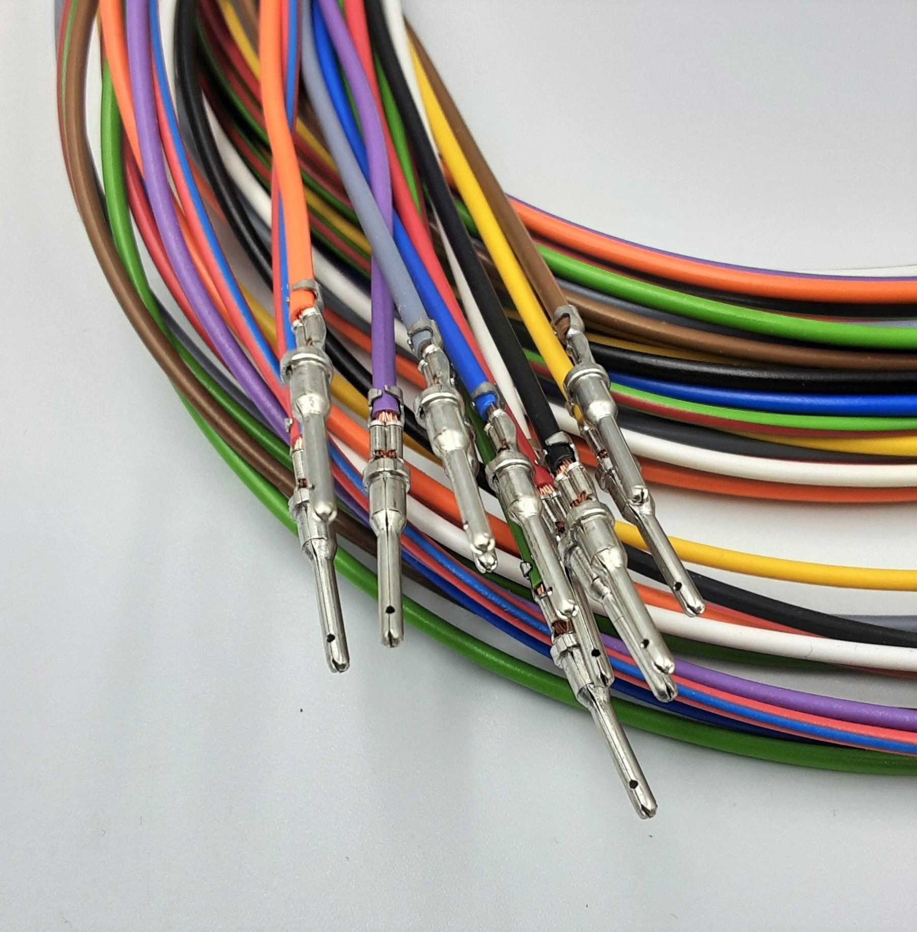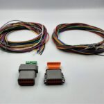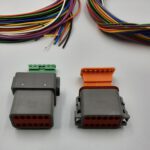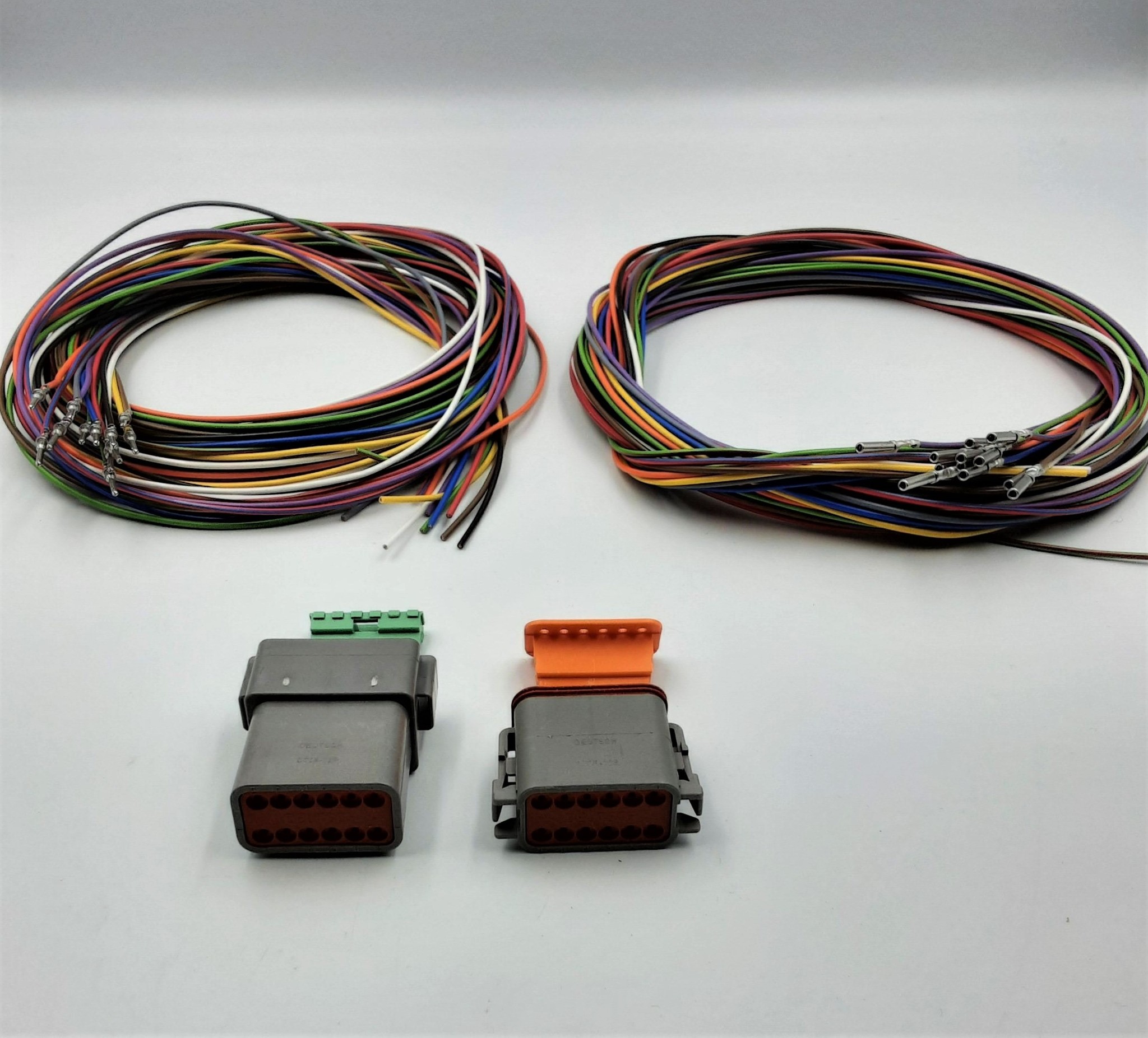 Complete Deutsch DT Pigtail-set met Deutsch DT 12-Pos. Receptacle & Plug + 24x 2 meter 1,5mm2 FLRY-B kabel in de kleuren Rood, Zwart, Bruin, Blauw, Geel, Grijs, Groen, Oranje, Paars, Wit, Groen-Geel en Rood-Groen met professioneel aangekrompen contacten en bijbehorende wedgelock voor het vastzetten en exact uitlijnen van de contacten in de behuizing.