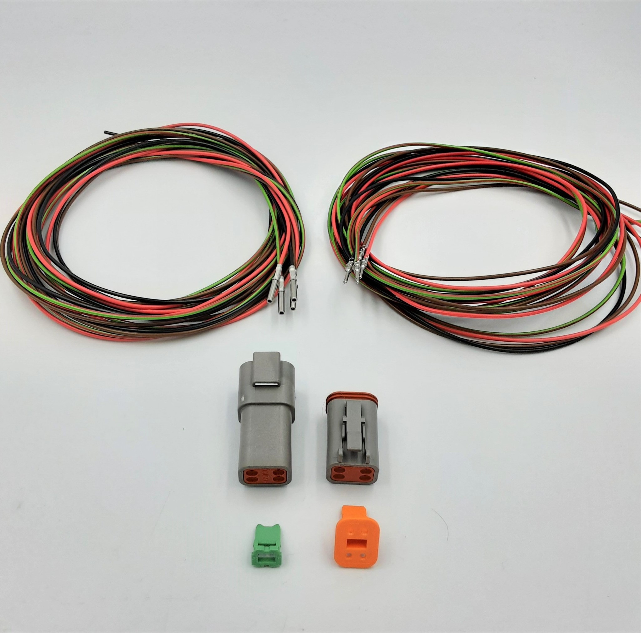Complete Deutsch DT Pigtail-set met originele TE Deutsch DT 4-Pos. Receptacle & Plug connectoren + 8x 2 meter 1,5mm2 FLRY-B kabel in de kleuren Rood, Zwart, Bruin en Rood-Groen met professioneel aangekrompen contacten en bijbehorende wedgelock voor het vastzetten en exact uitlijnen van de contacten in de behuizing.