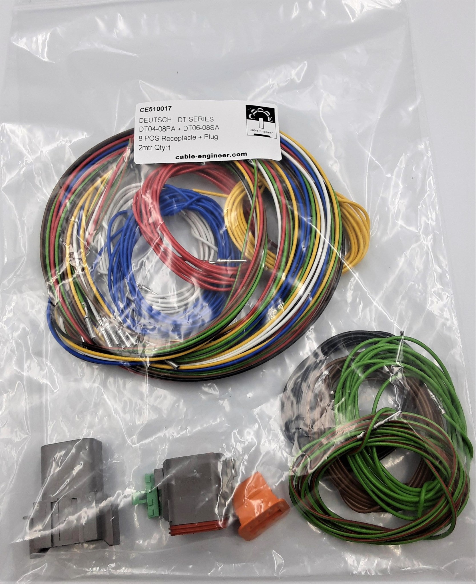 Complete Plug set met Deutsch DT 8-Pos. Receptacle & Plug + 16x 2 meter 1,5mm2 FLRY-B kabel in de kleuren Rood, Zwart, Bruin, Blauw, Geel, Groen, Wit en Rood-Groen met professioneel aangekrompen contacten en bijbehorende wedgelock voor het vastzetten en exact uitlijnen van de contacten in de behuizing.