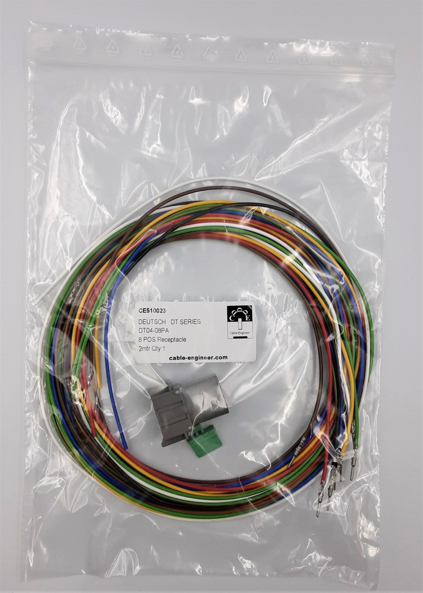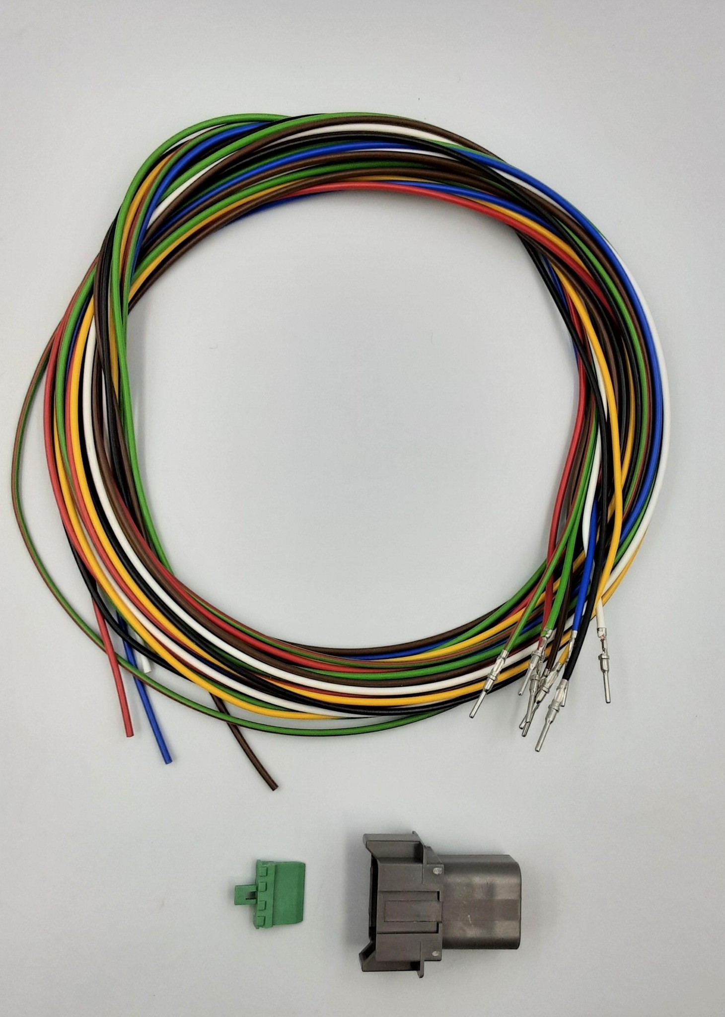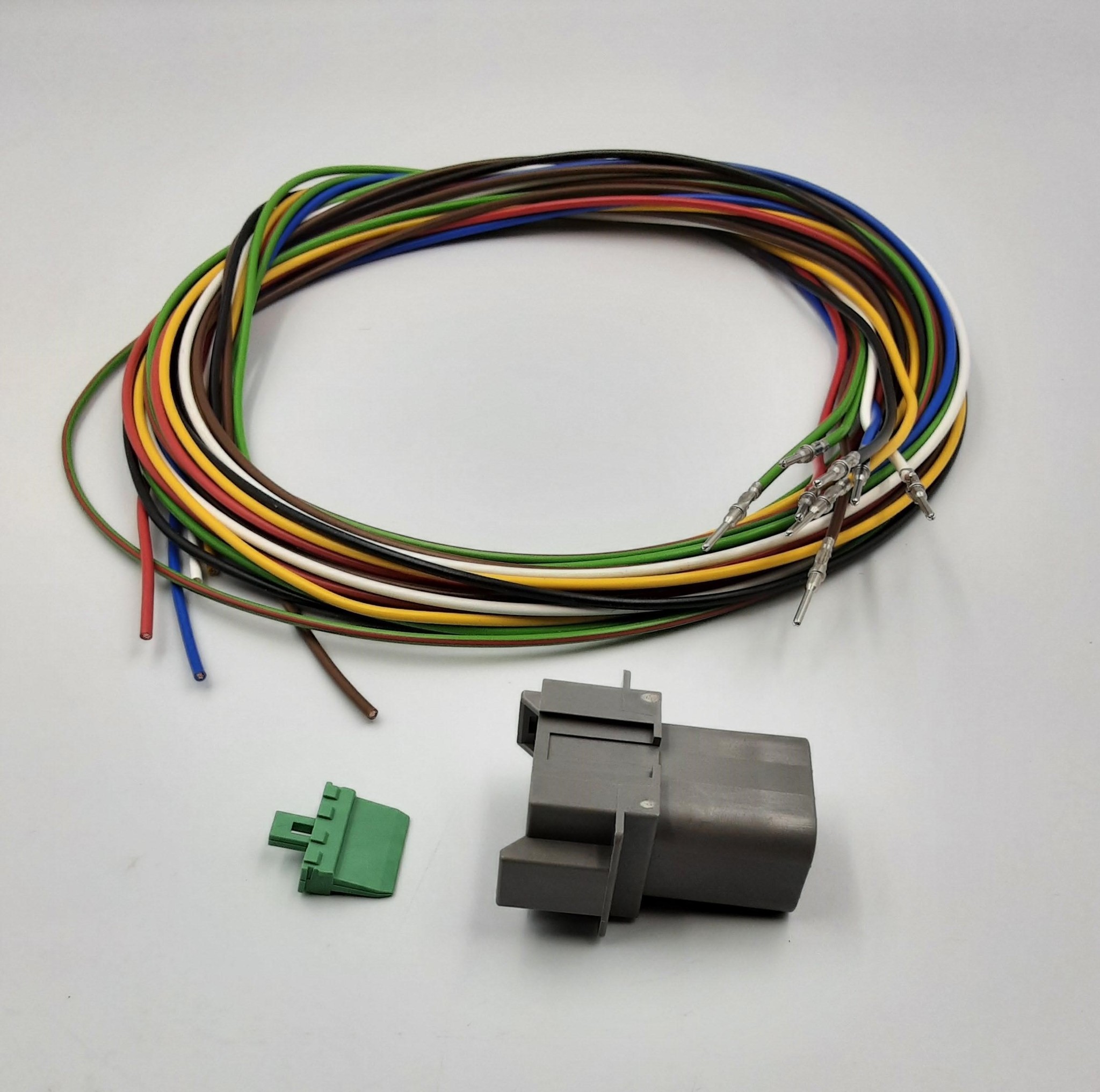 Complete Deutsch DT Pigtail-set met Deutsch DT 8-Pos. Receptacle (vrouw) + 8x 2 meter 0,75mm2 FLRY-B kabel met 0,75mm2 in de kleuren Rood, Zwart, Bruin, Blauw, Geel, Groen, Wit en Rood-Groen met professioneel aangekrompen contacten en bijbehorende wedgelock voor het vastzetten en exact uitlijnen van de contacten in de behuizing.