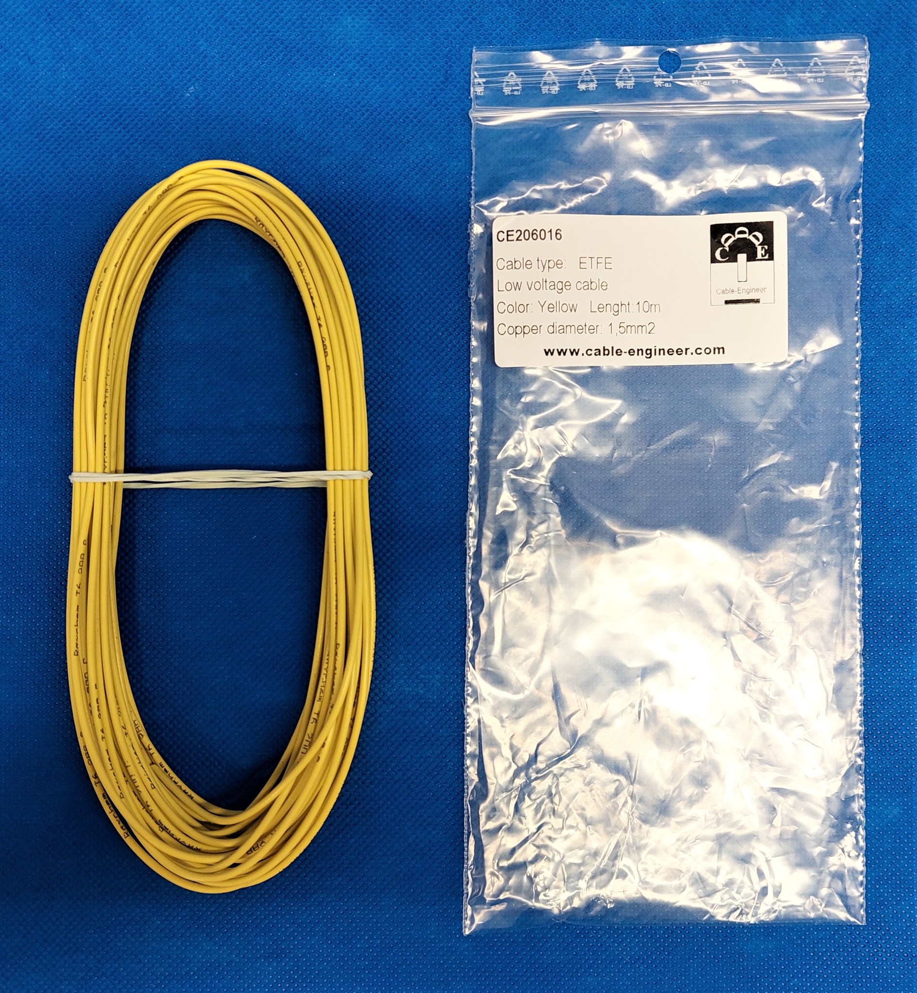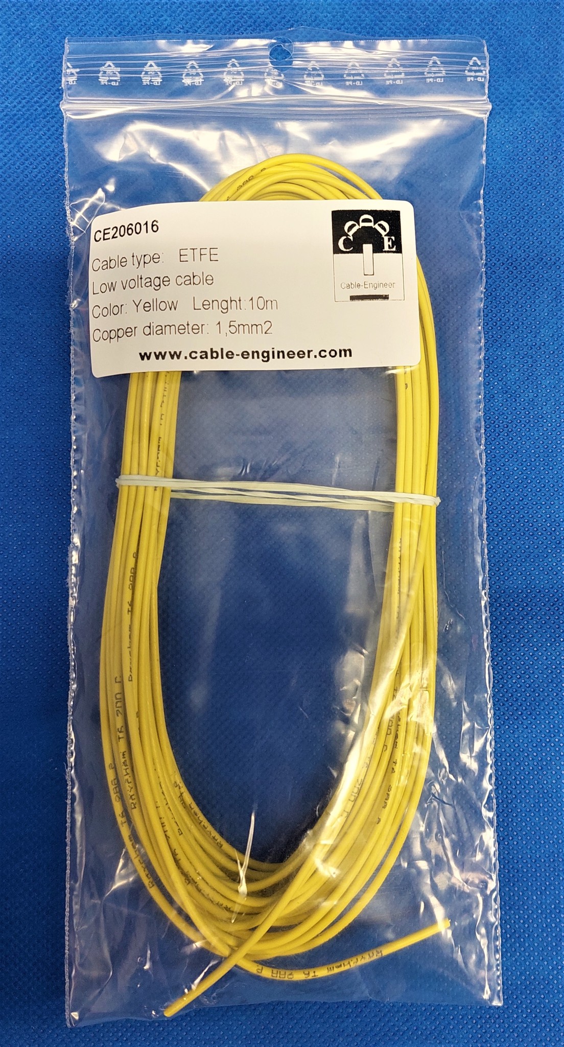 Bijzondere ETFE kabel van TE connectivity: Raychem T6 +200°C 1,5 mm2 (16AWG) Geel - 10 meter hand gerold. Laag Voltage (max. 50 Volt ) Automotive kabel.