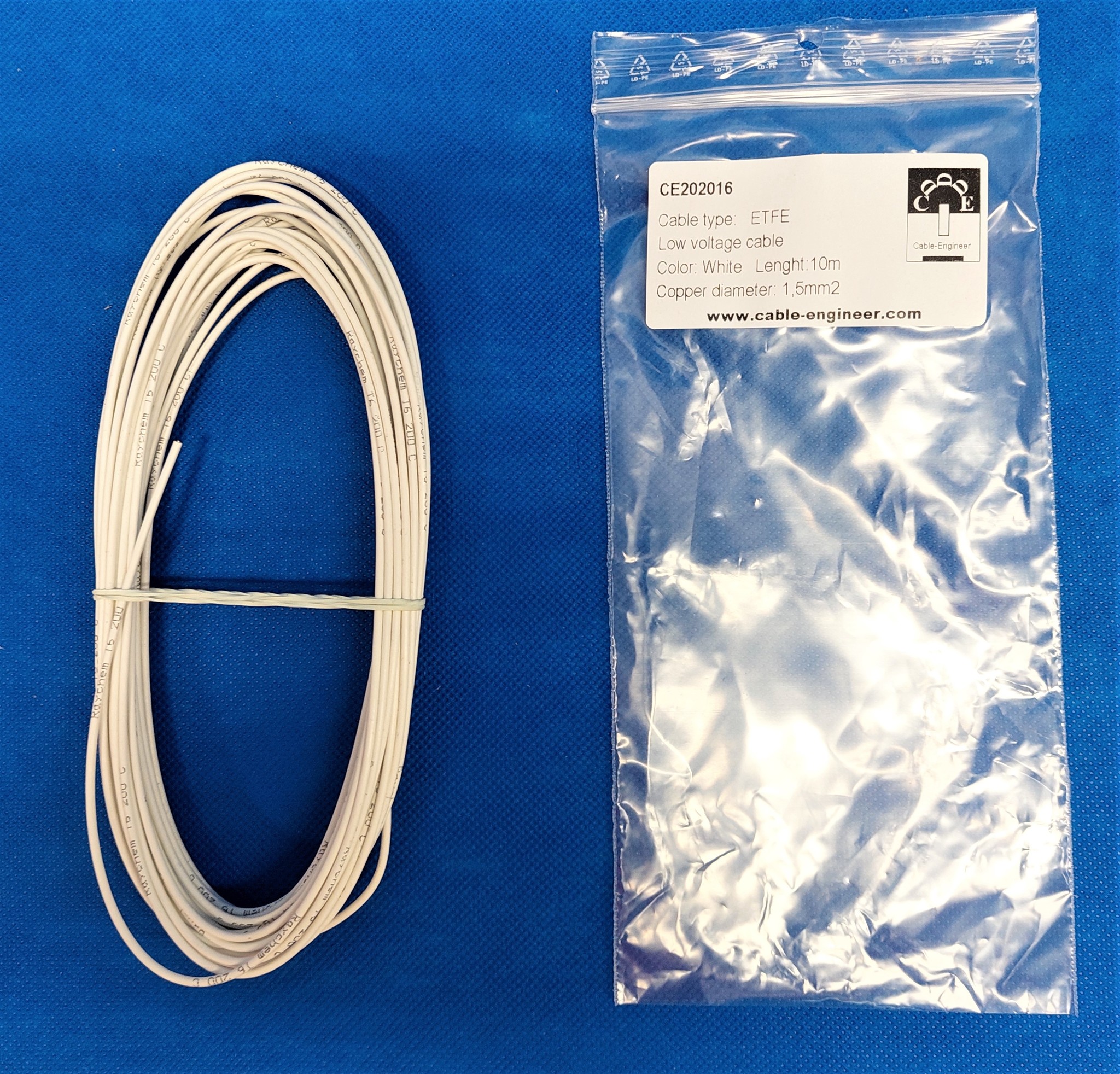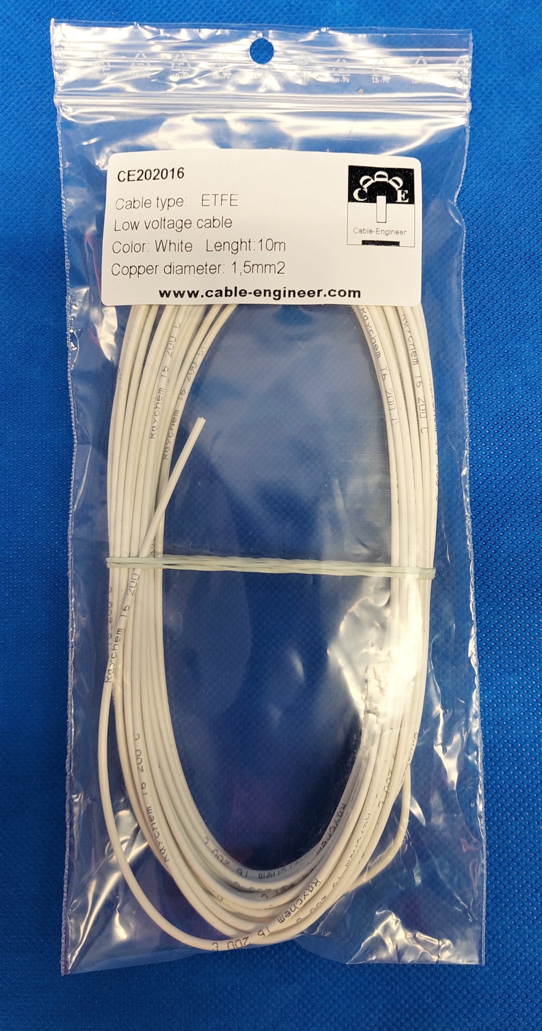 Bijzondere ETFE kabel van TE connectivity: Raychem T6 200°C - 1,5 mm2 (16AWG) Wit - 10meter hand gerold. Laag Voltage (max. 50 Volt ) Automotive kabel.