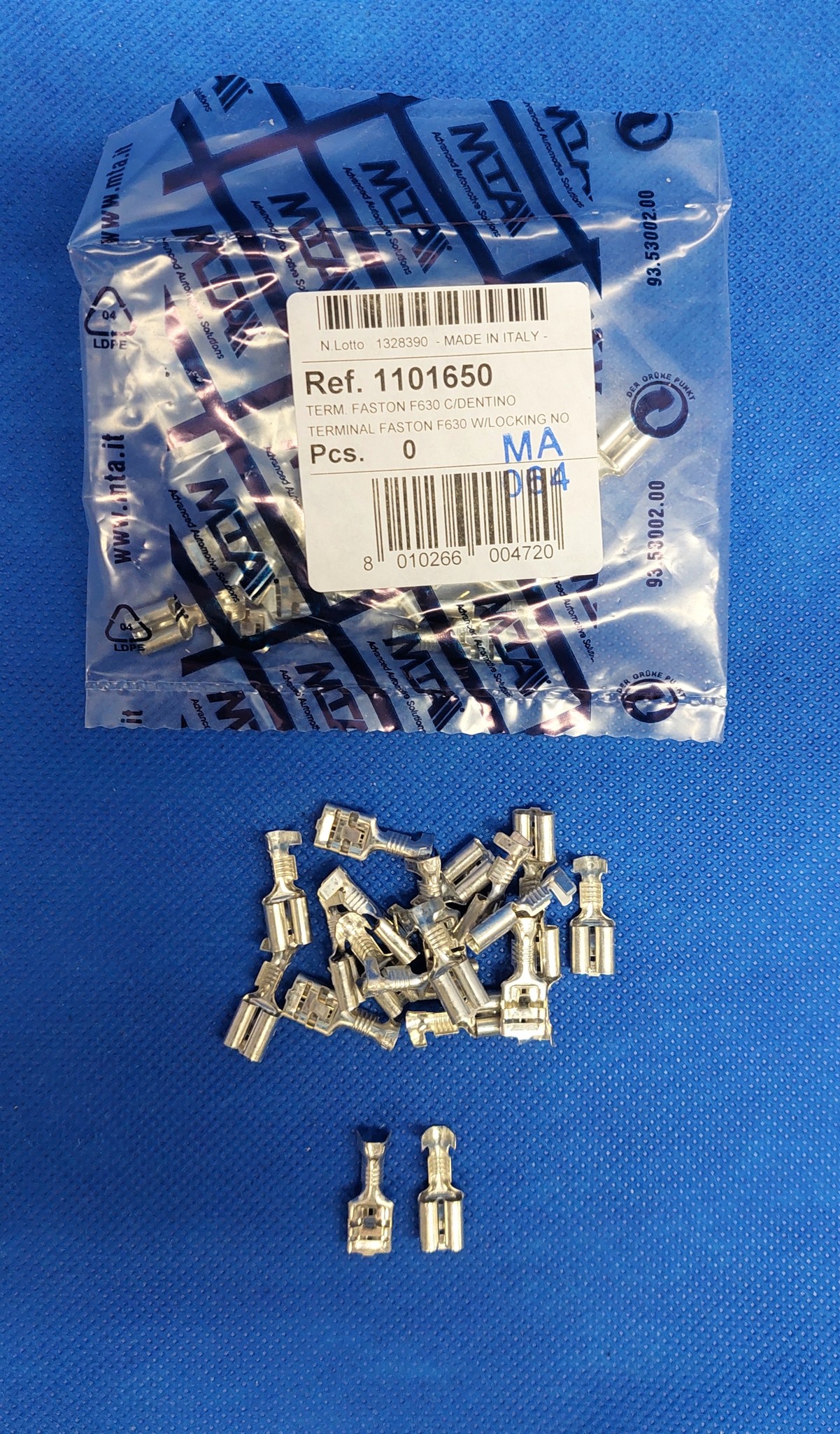 MTA Fastons 6,3 x 0,8 mm - F630 met "locking notch" vergrendel-haak of lipje gemaakt van koper/zink/tin legering voor extra bescherming tegen corrosie.