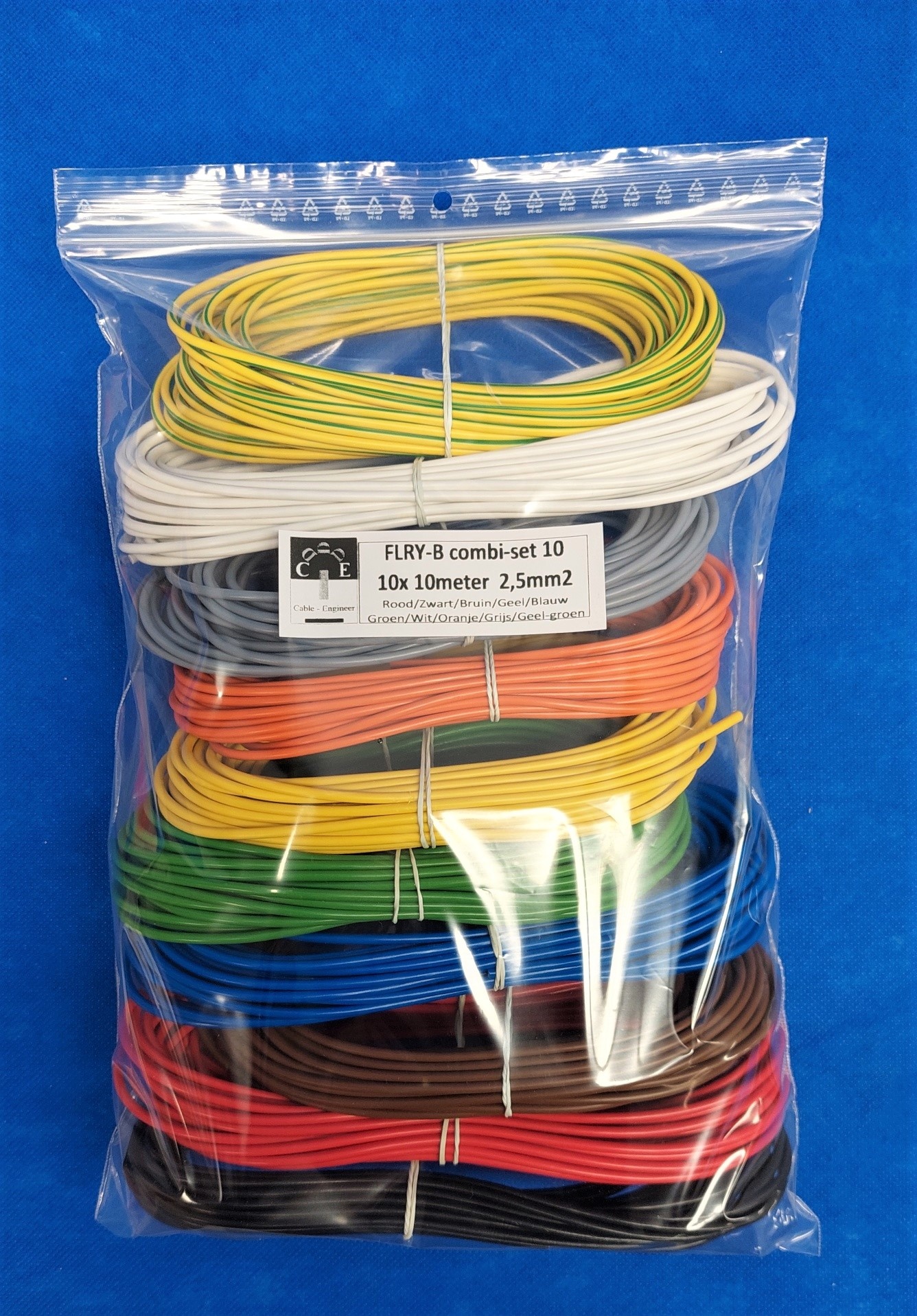 FLRY-B 2,5 mm2 Combi-set 10: 10x 10 meter voertuigkabel in de kleuren: Rood/Zwart/Bruin/Blauw/Geel/Groen/Grijs/Oranje/Wit en Geel-Groen.