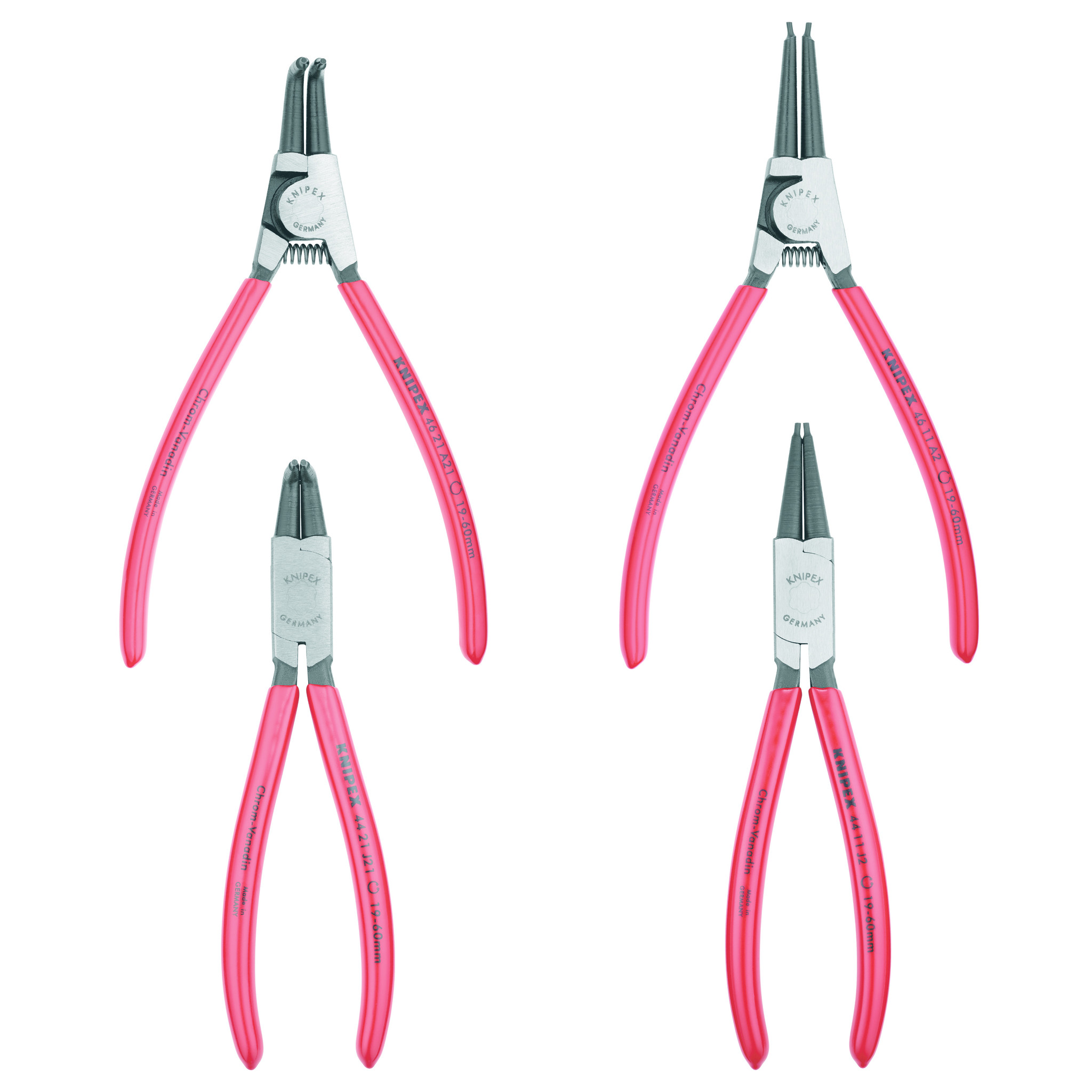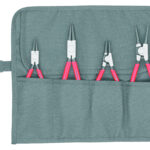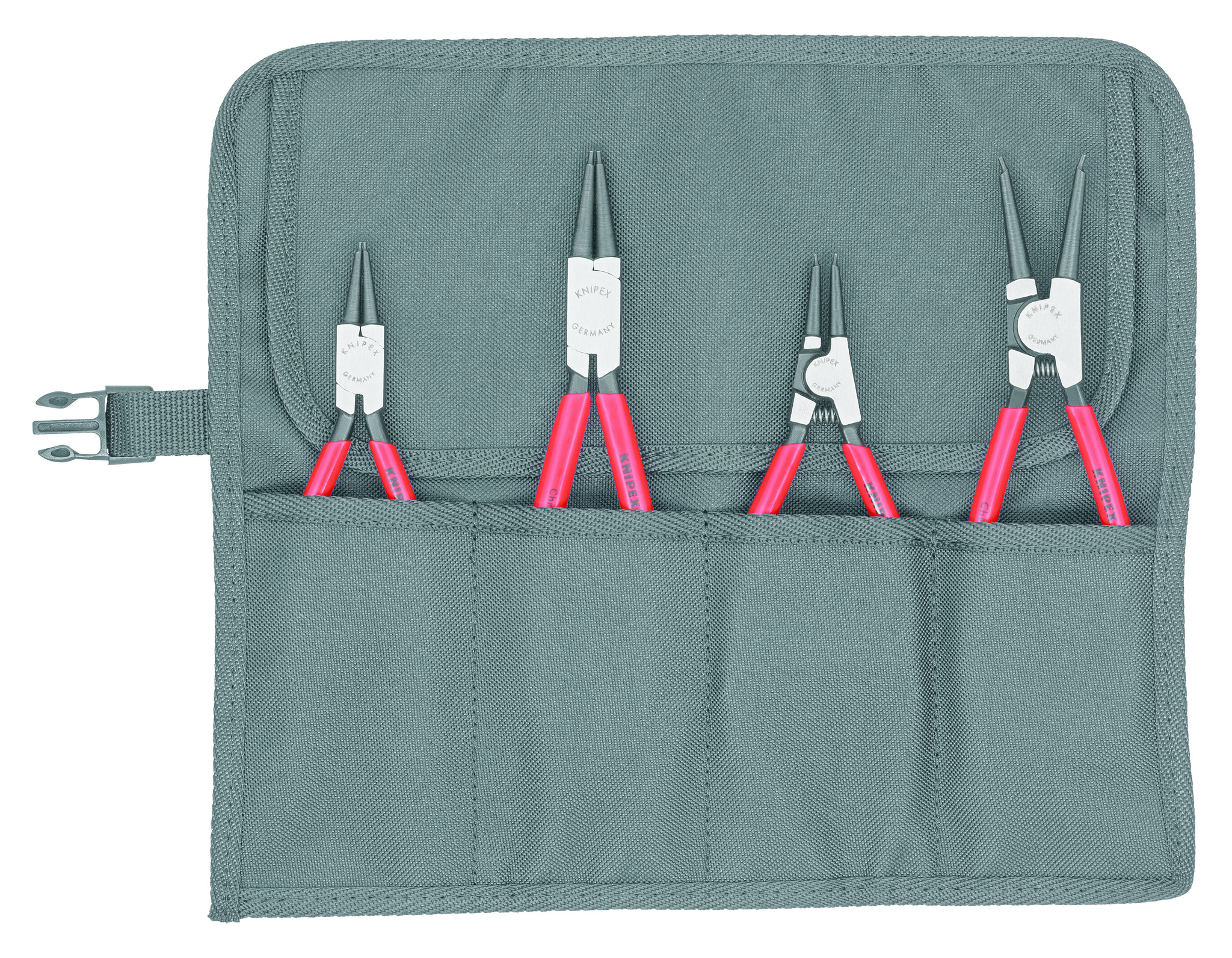 Professionele borgveertangenset van Knipex met 4 speciale borgveertangen waarvan 2 voor binnenringen in borgringen en 2 voor buitenringen op assen, netjes en veilig opgeborgen in een ijzersterke roltas van speciaal versterkt polyester.