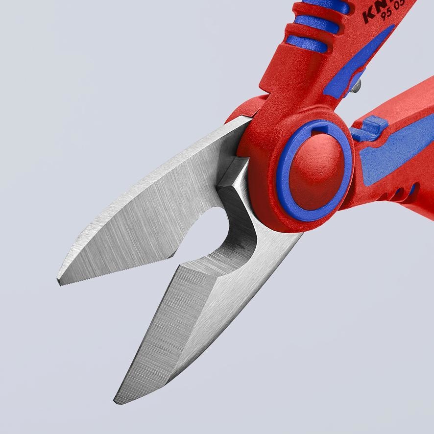 Deze multifunctionele schaar van Knipex is gemaakt van extra gehard en gebruineerd roestvrij staal waarbij de snijranden nog een extra gehard zijn tot 56HRC. Door de micro-tanden op de snijranden glijd de draad niet weg en heb je altijd een scherpe en nette snijrand.