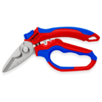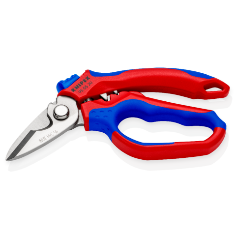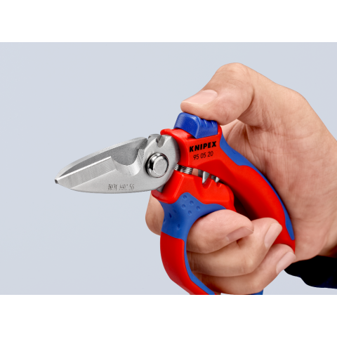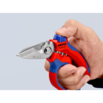 Handige en sterke elektriciensschaar van Knipex met gebogen frame van °45 en aangepast handvat voor optimale grip en kracht op je werkstuk. Uitgevoerd met openingsveer waardoor je erg snel, makkelijk en precies kan werken met deze speciale schaar.
