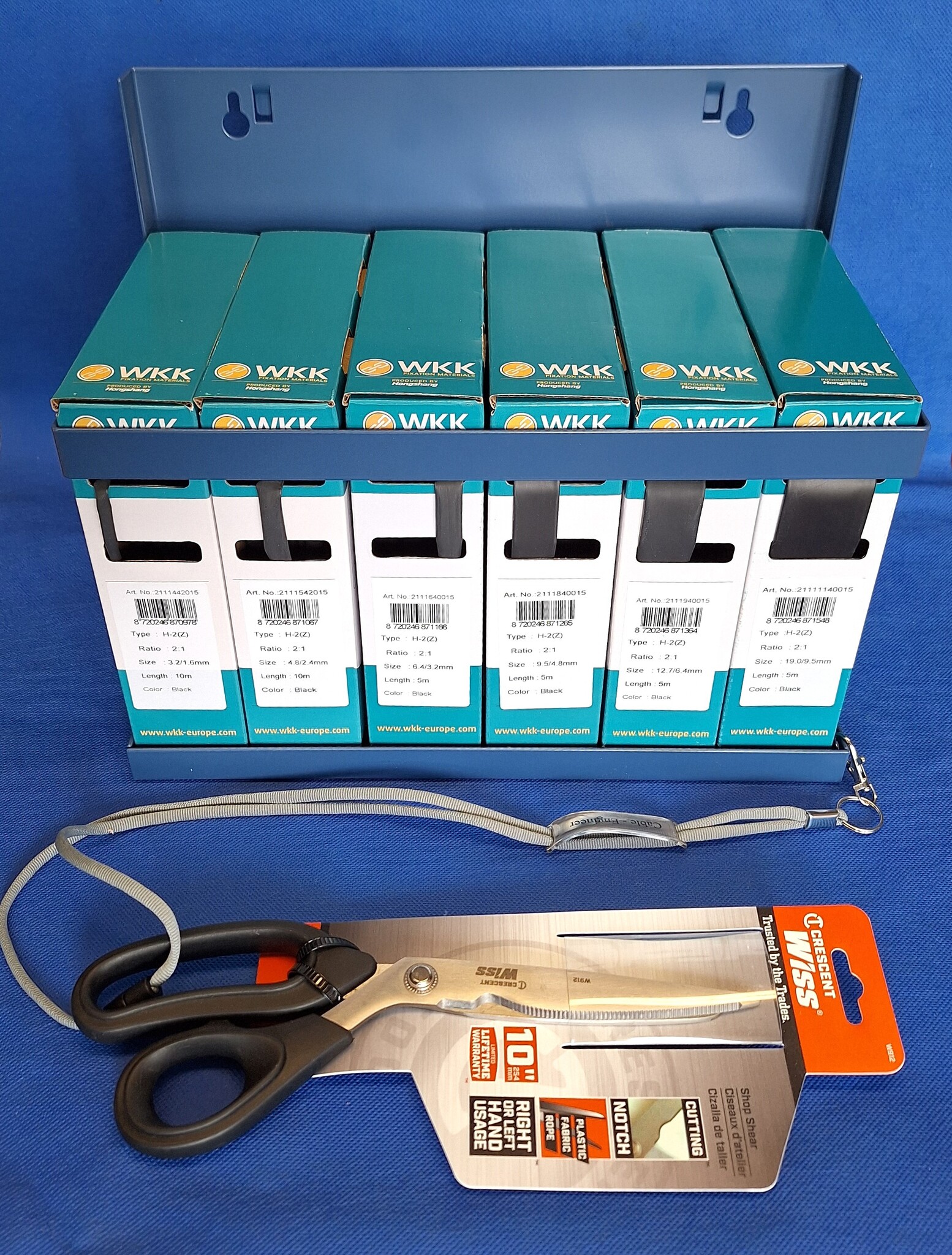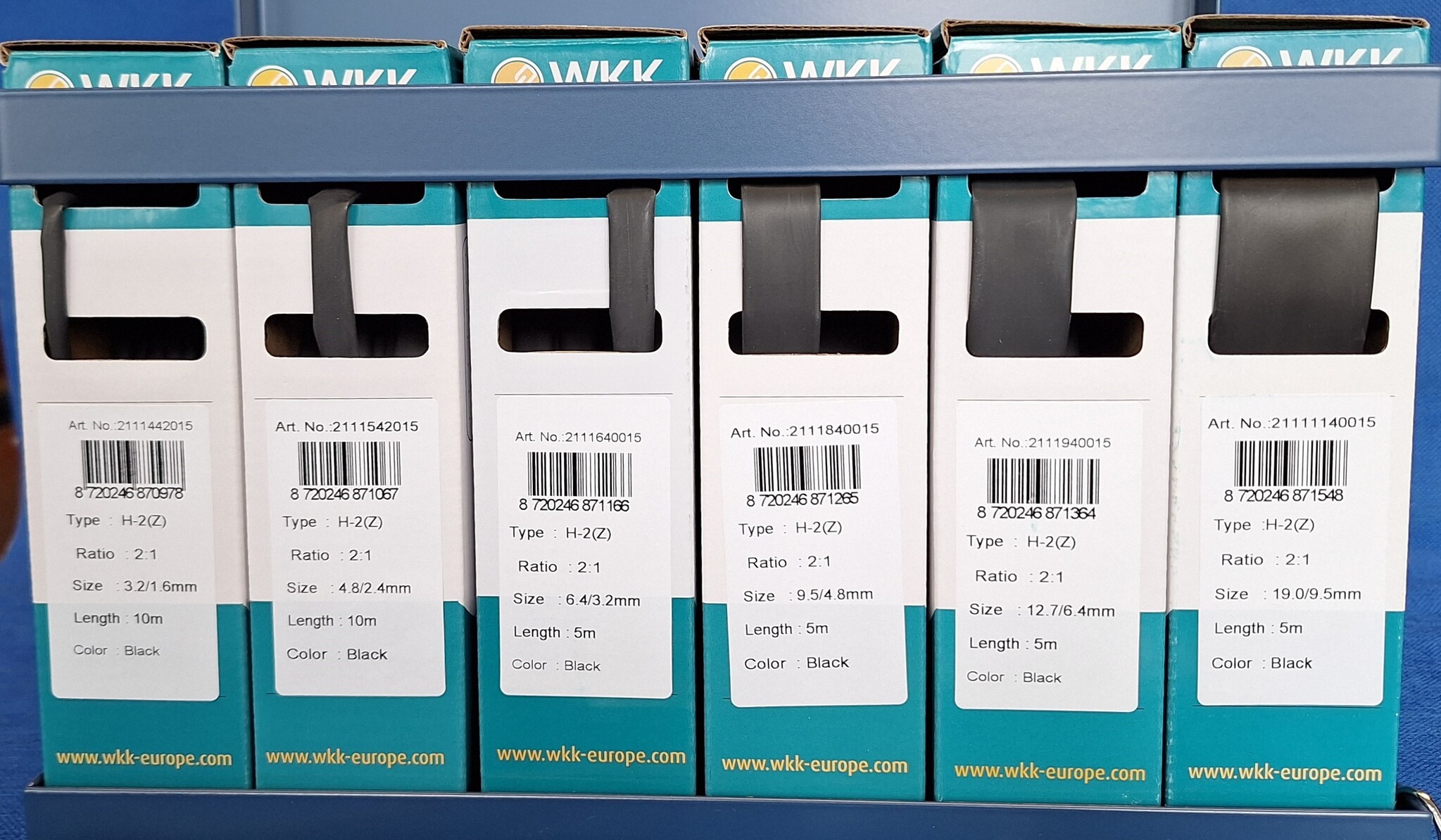 Stalen display met 6 verschillende maten enkelwandige krimpkous met krimpratio 2:1