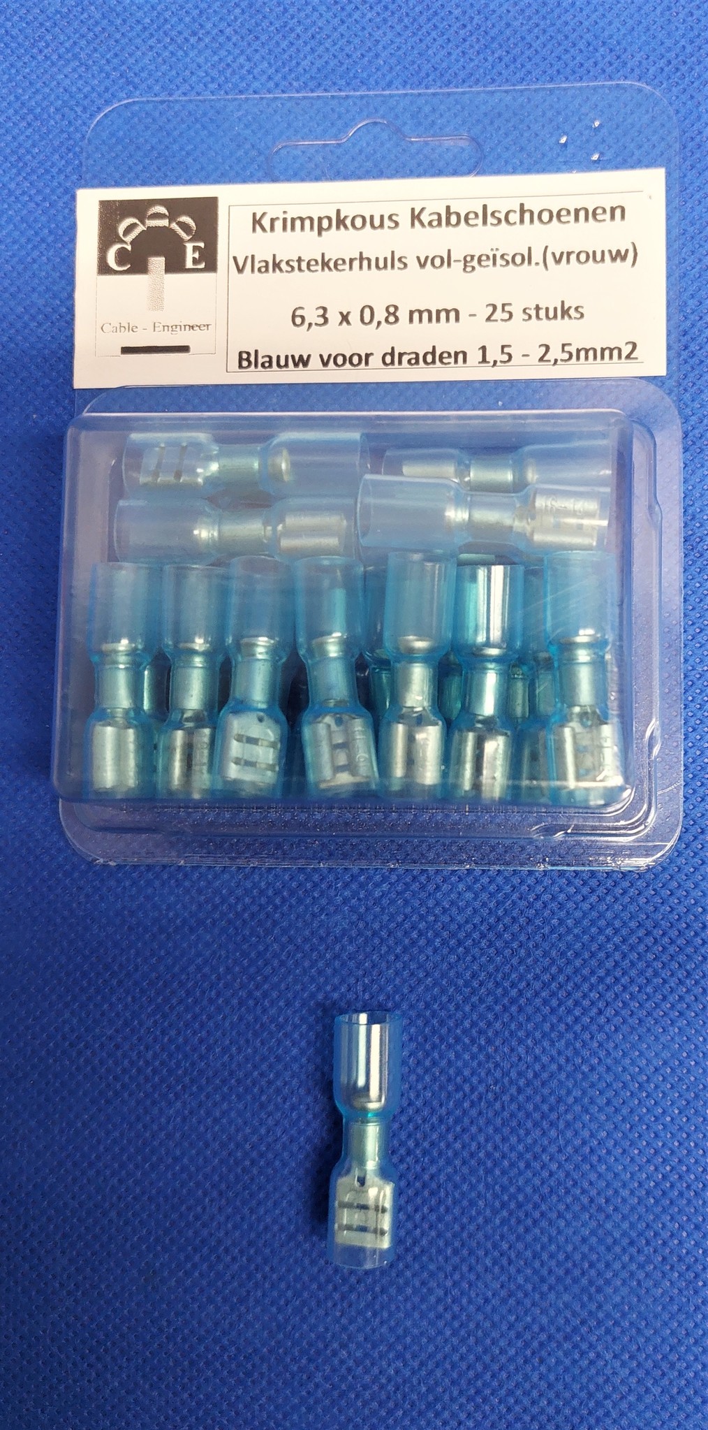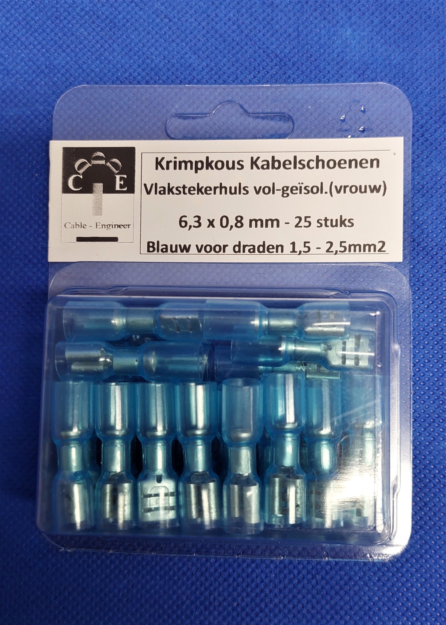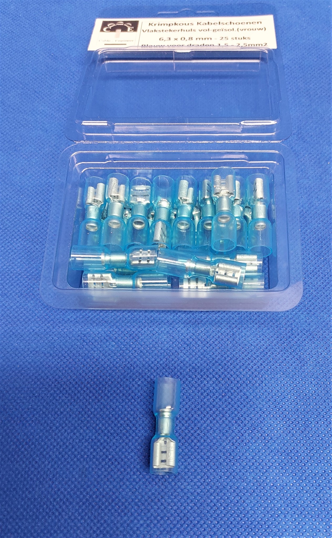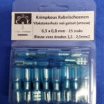 Krimpkous faston of vlakstekerhuls - Blauw - 6,3 x 0,8 mm voor draden van 1,5 t/m 2,5 mm2 - 25 stuks per verpakking