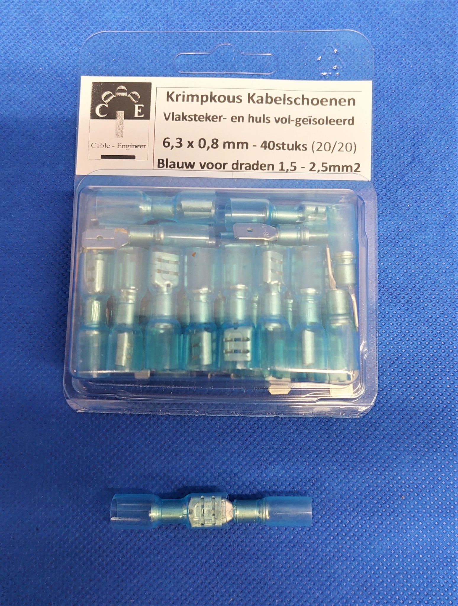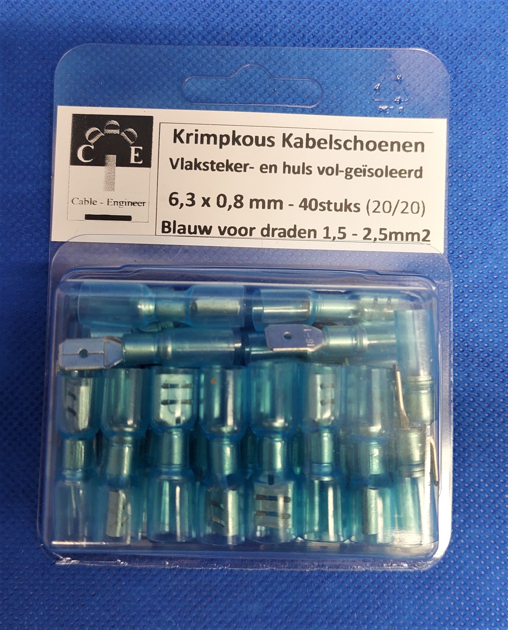 Waterdichte krimpkous faston en tab - Blauw - 6,3 x 0,8 mm (20x man / 20x vrouw vol-geïsoleerd) voor draden van 1,5 t/m - 2,5 mm2