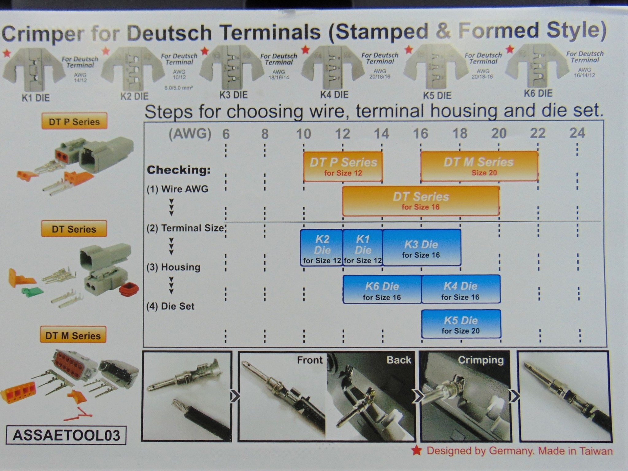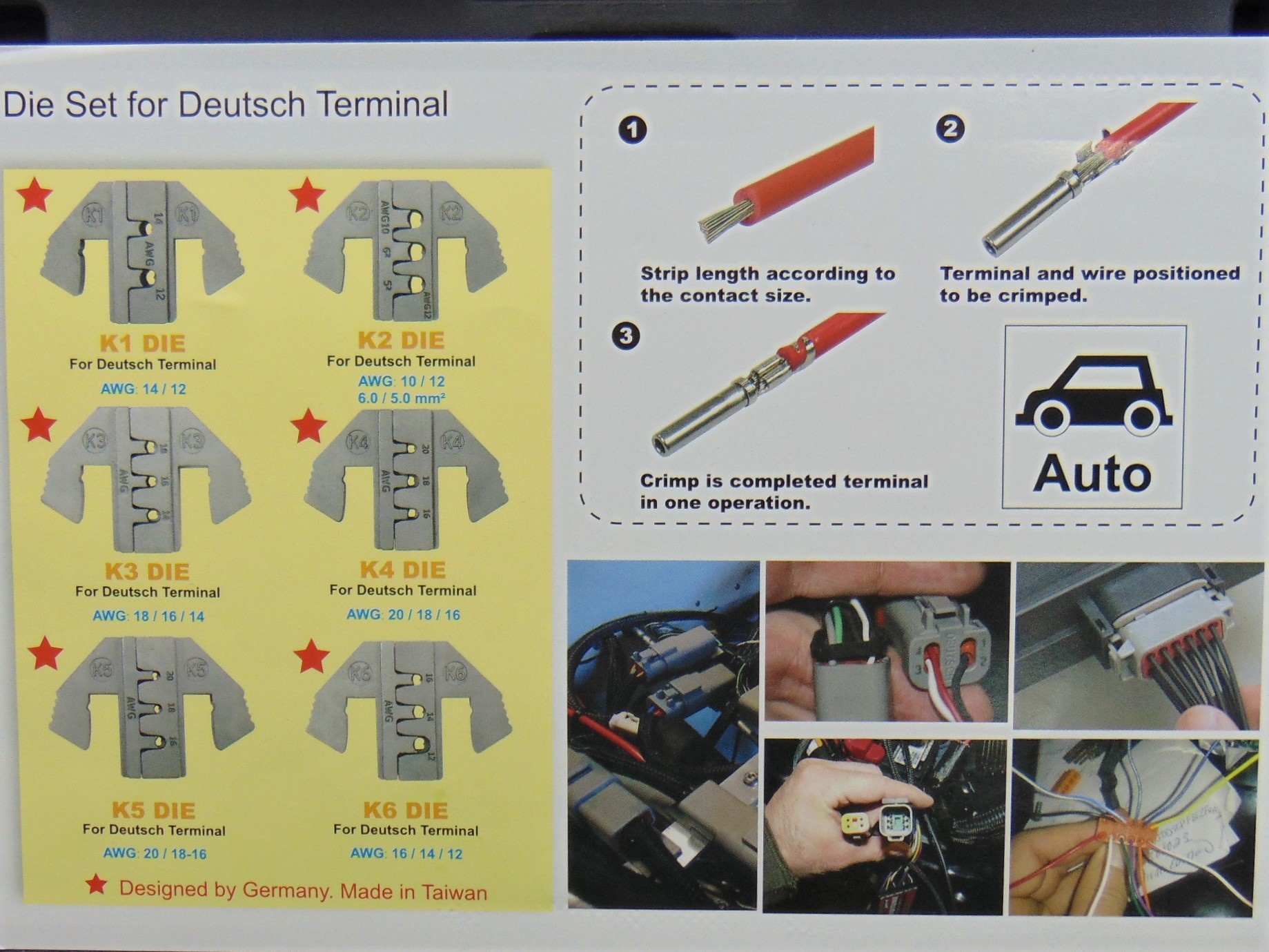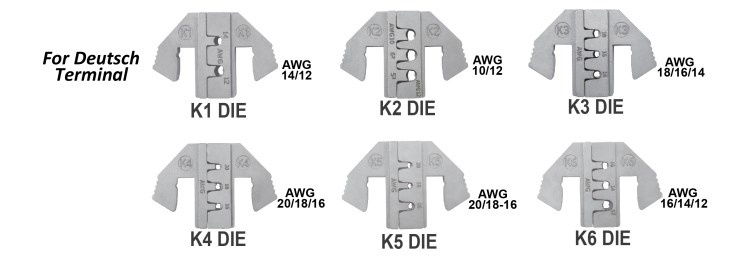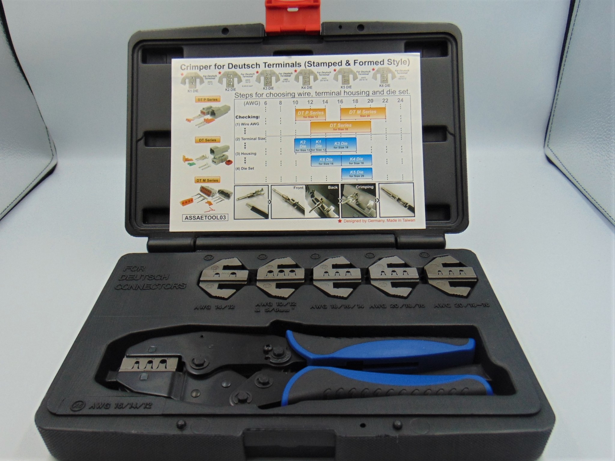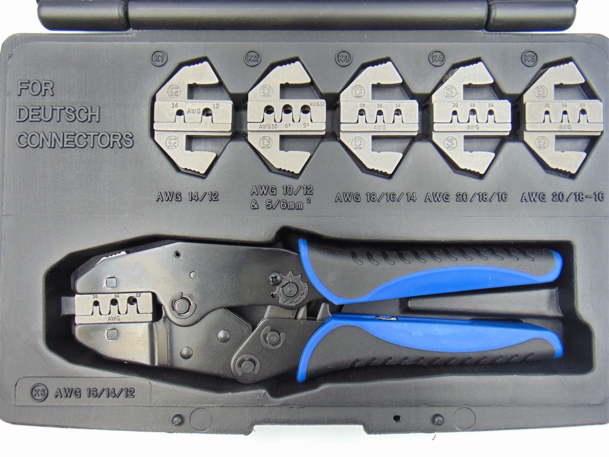 In deze set zit een oerdegelijke, stalen multi-krimptang met 6 verwisselbare profielen speciaal voor welbekende en geprezen Deutsch DT serie connectoren. De volgende speciale krimpprofielen voor Deutsch connectoren zitten in deze set: