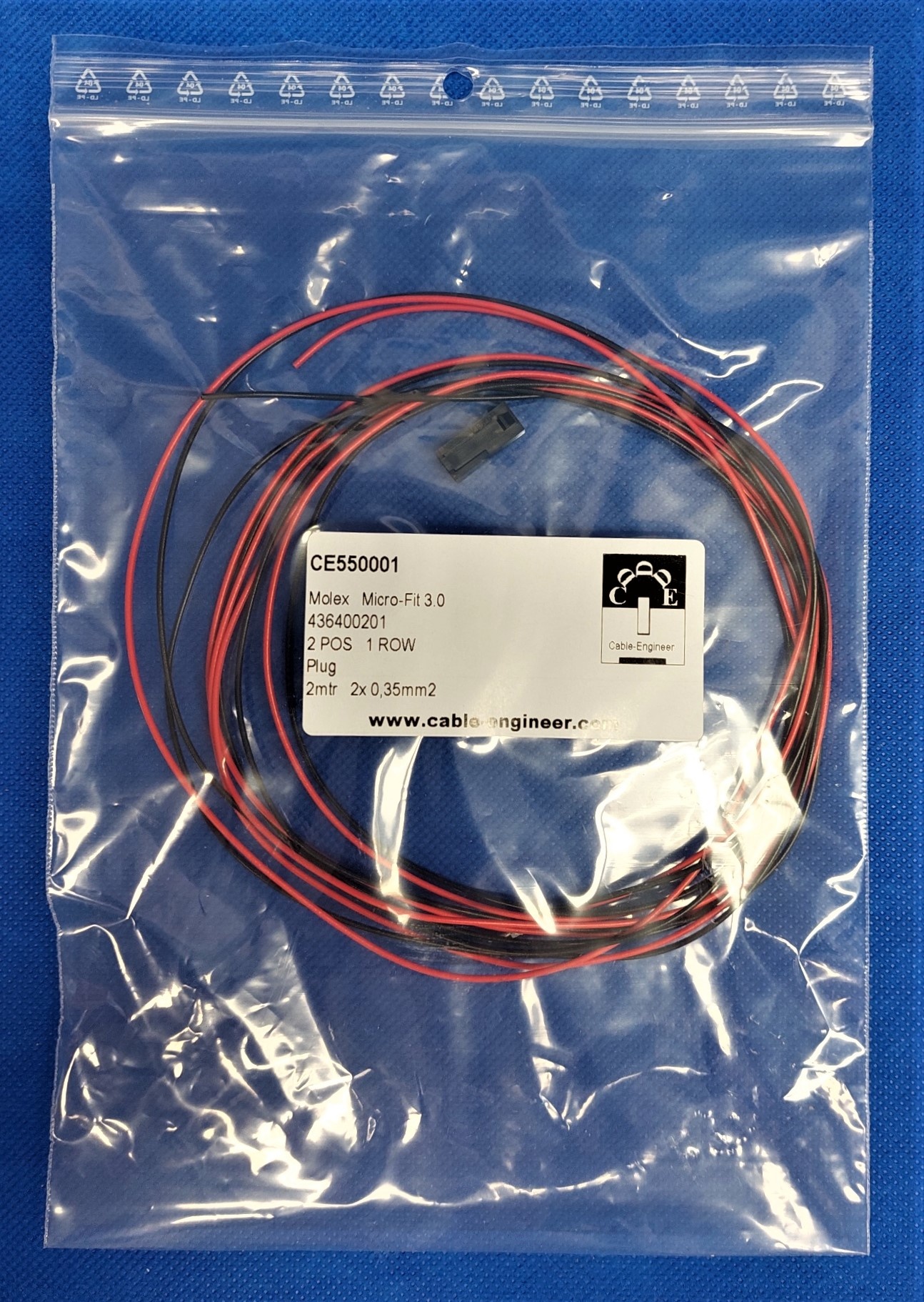 Pre-crimped Molex Micro Fit 3.0 set: Plug Housing met 2x 2m. 0,35mm2 kabel met contacten aan de kabel