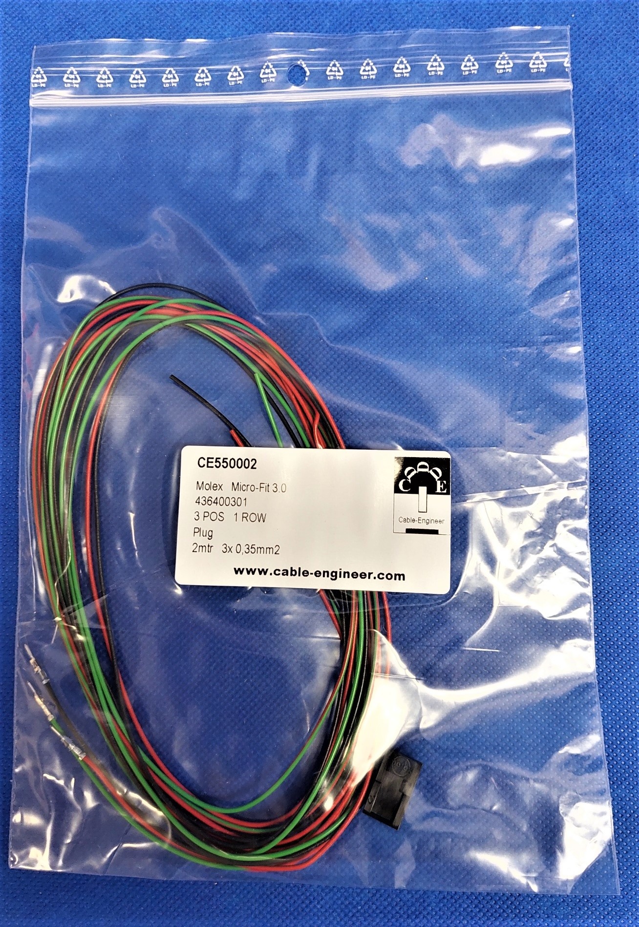 Pre-crimped Molex Micro Fit 3.0 set: Plug Housing met 3x 2m. 0,35mm2 kabel met contacten gekrompen