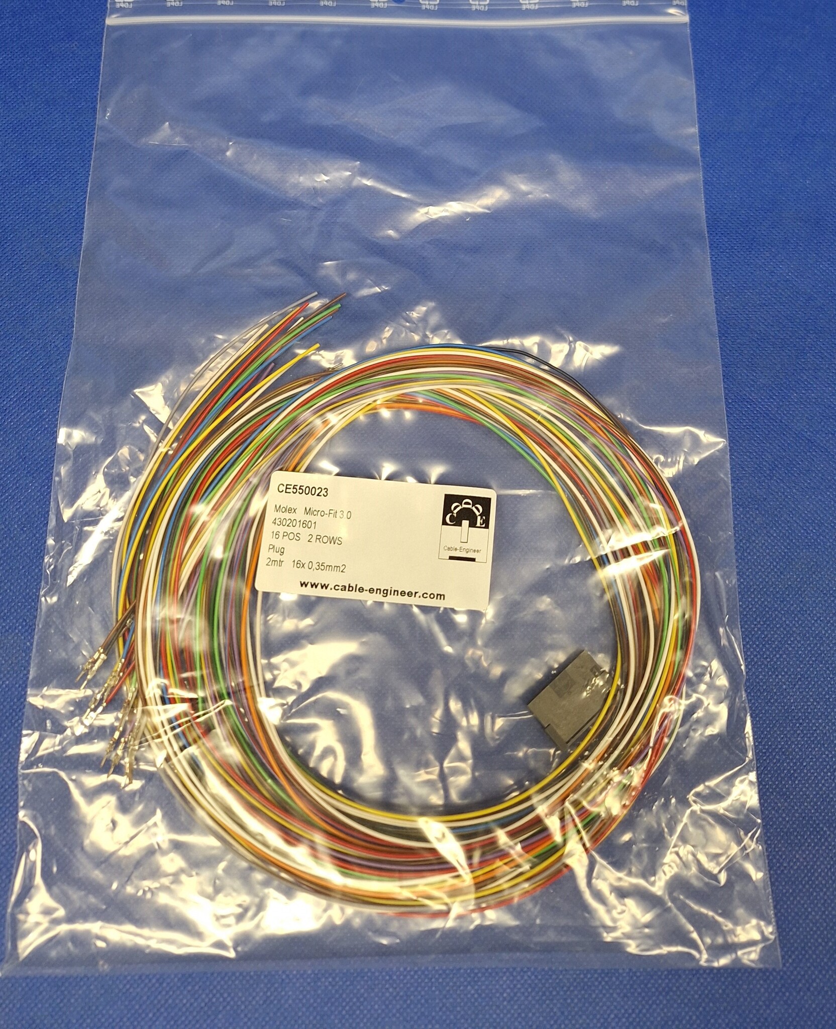 Pre-crimped Molex Micro Fit 3.0 set: 16-Pos/2-Rij Plug Housing met 14x 2m. 0,35mm2 kabel met contacten aan de kabel