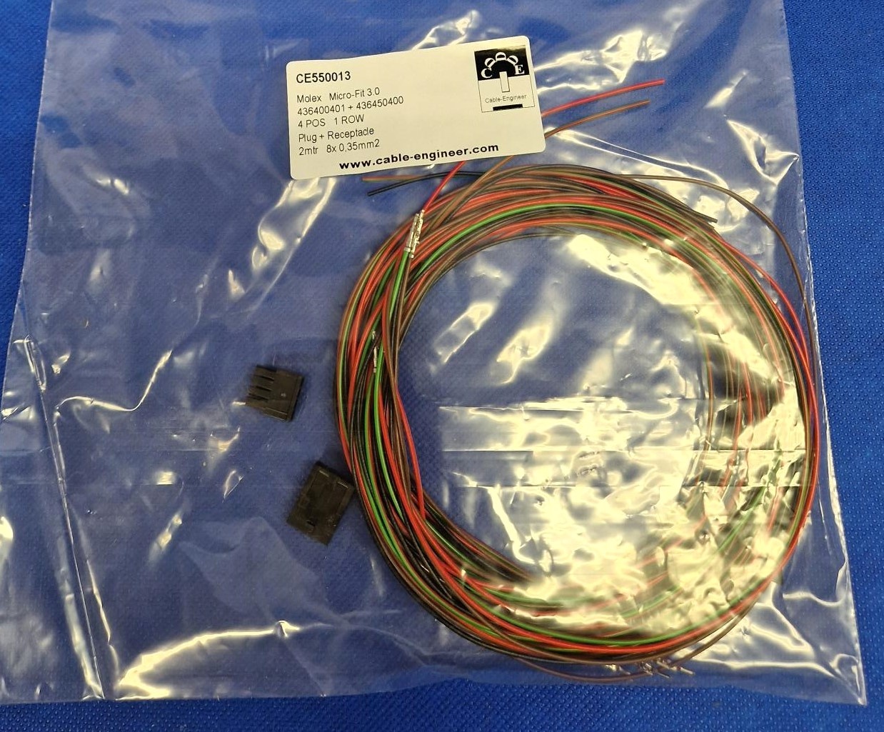 Pre-crimped Molex Micro Fit 3.0 set: 4-Pos. Plug + Receptacle Housing met 8x 2m. 0,35mm2 FLRY-A kabel met gekrompen/gemonteerde contacten.