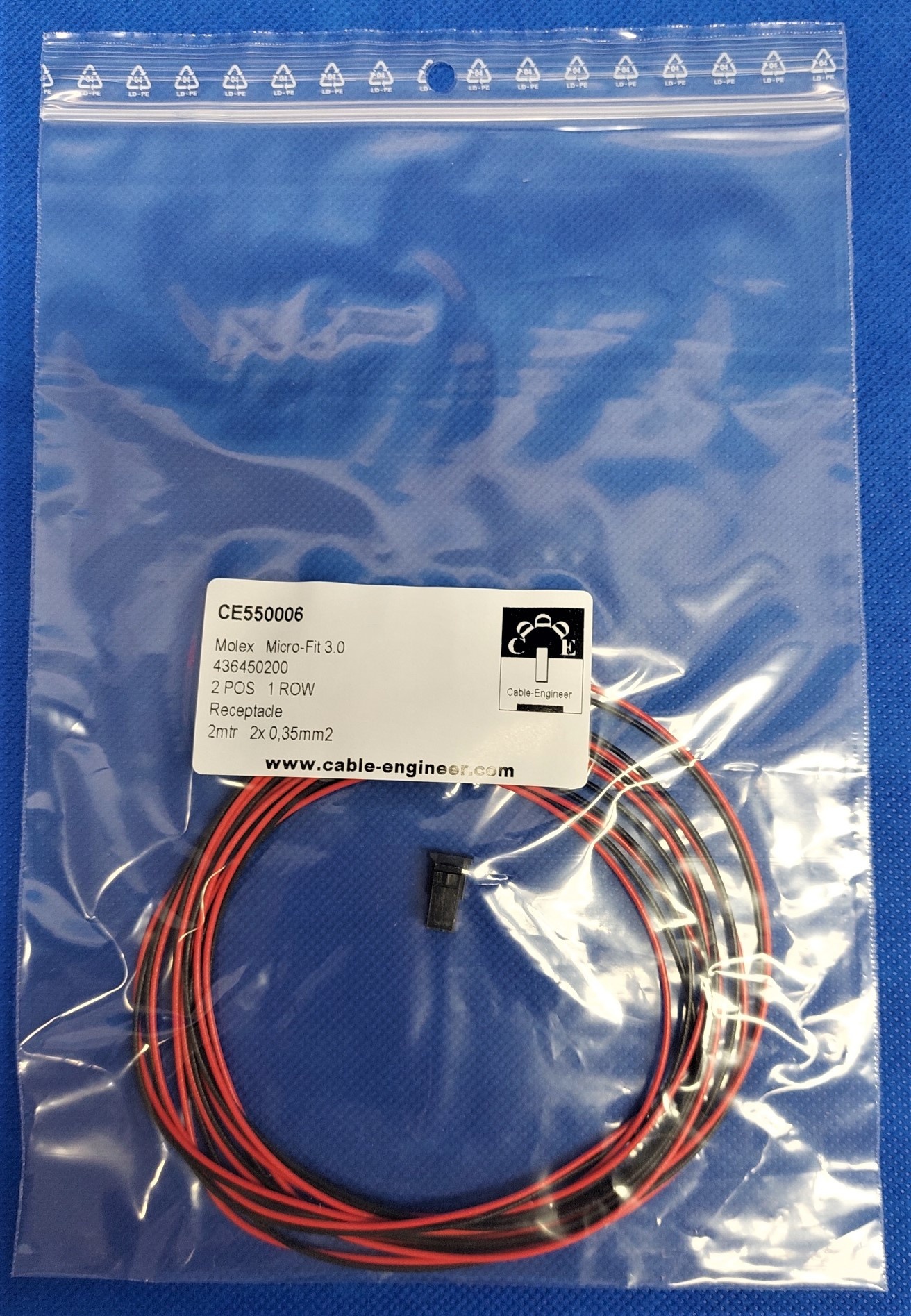 Pre-crimped Molex Micro Fit 3.0 set: 2-positie's Receptacle Housing met 2x 2m. 0,35mm2 FLRY-A kabel met gekrompen/geïnstalleerde contacten