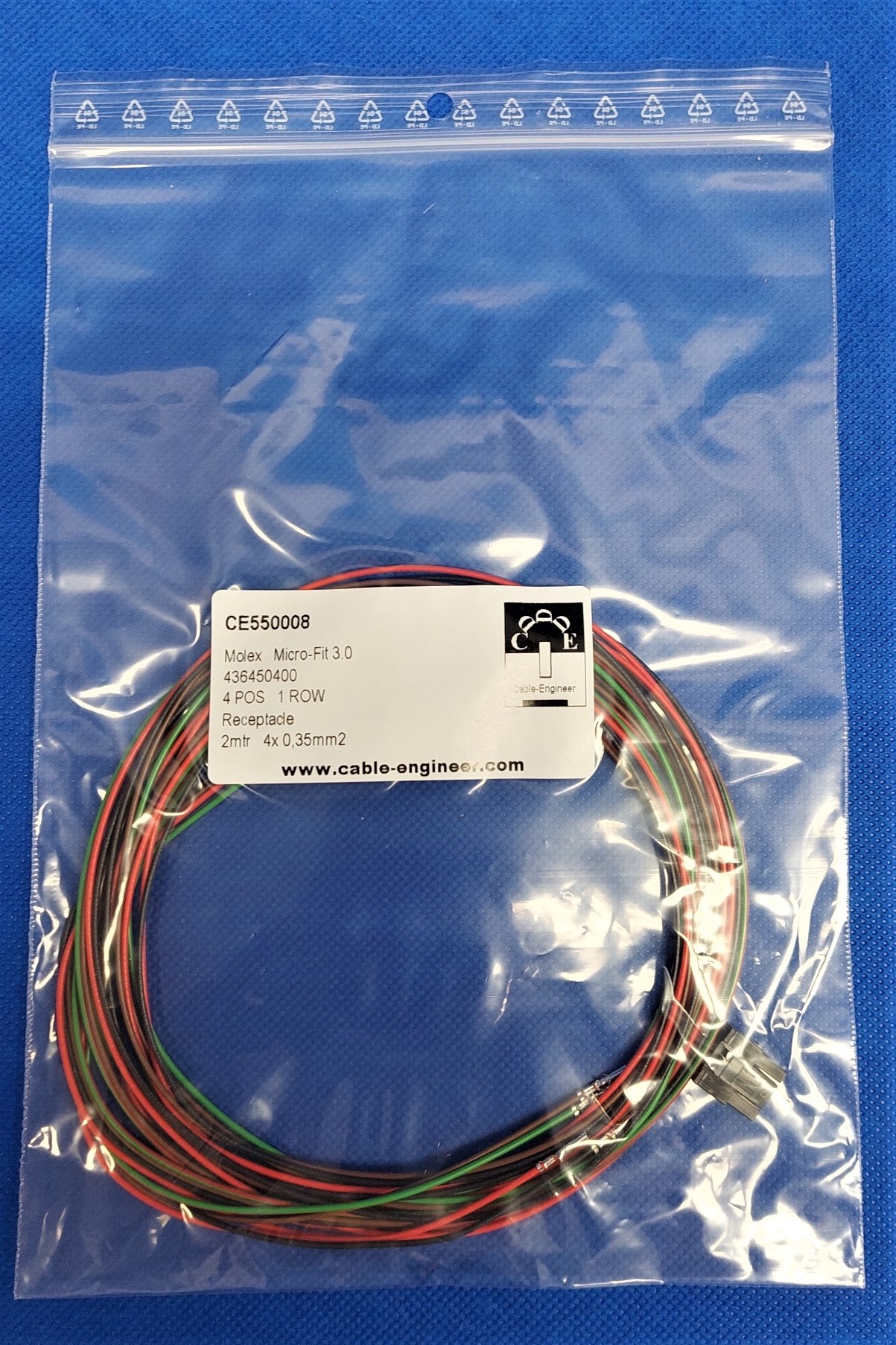 Pre-crimped Molex MicroFit 3.0 set: 4-Pos. Receptacle Housing met 4x 2m. 0,35mm2 kabel met contacten gemonteerd