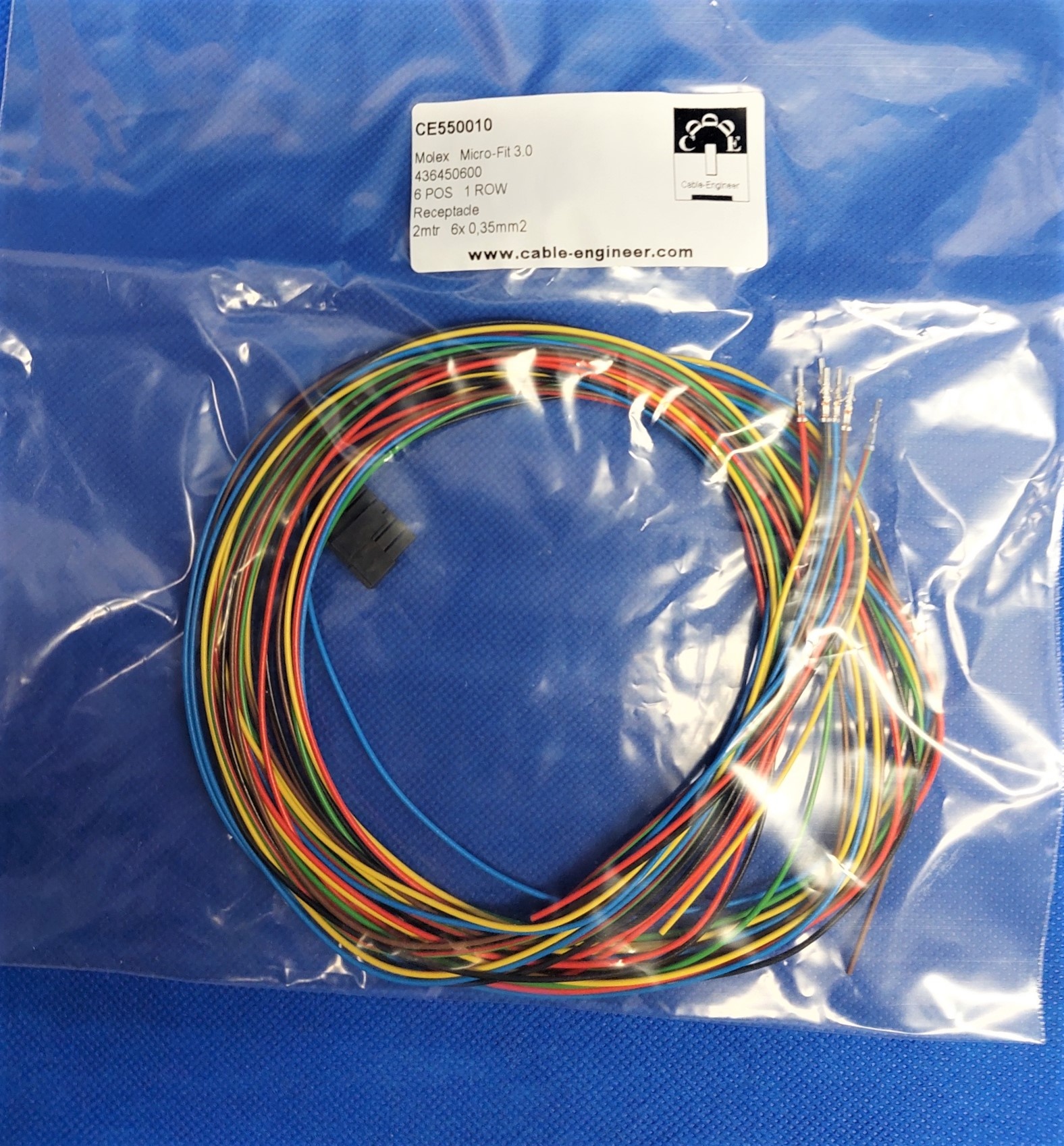 Pre-crimped Molex MicroFit 3.0 set: 6-Pos. Receptacle Housing met 6x 2m. 0,35mm2 kabel met contacten gemonteerd