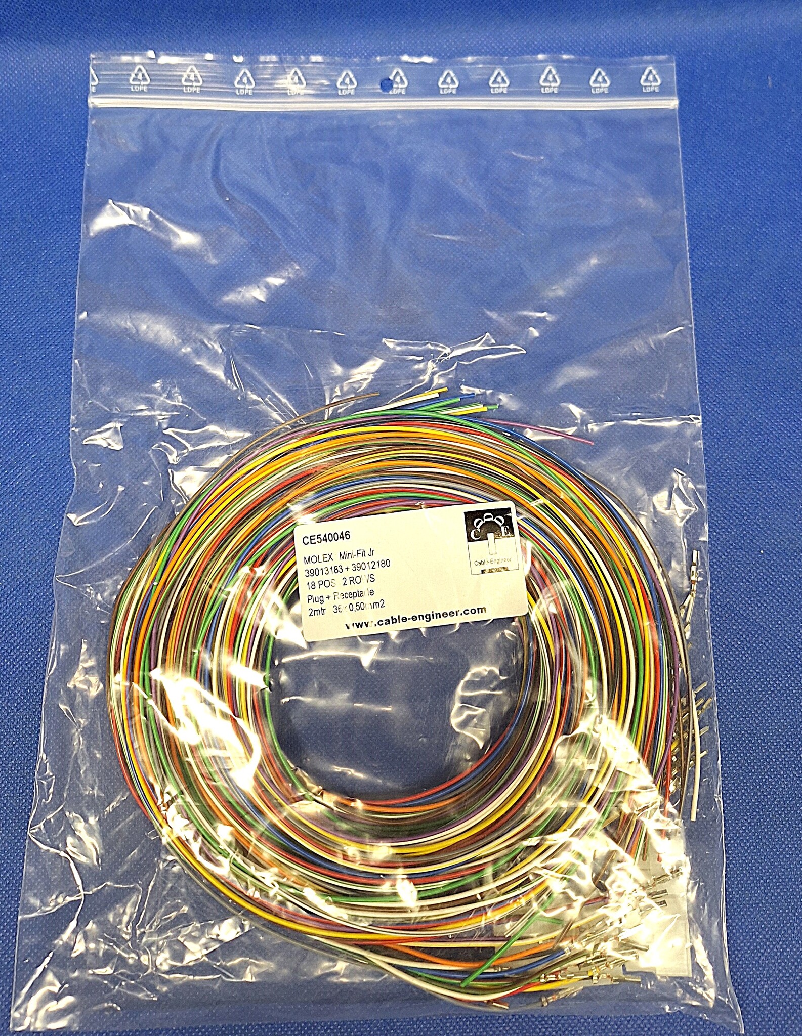 Complete sets uit eigen fabriek met originele Molex MiniFit Jr. connectoren, pre-crimped contacten en professionele 0,50 mm2 FLRY-B flexibele voertuigkabel. De sets zijn 100% gecontroleerd en getest en direct klaar voor gebruik. De kabel met contacten laten wij met opzet los in de verpakking zitten zodat je zelf de volgorde of positie van de gekleurde kabel kan bepalen.