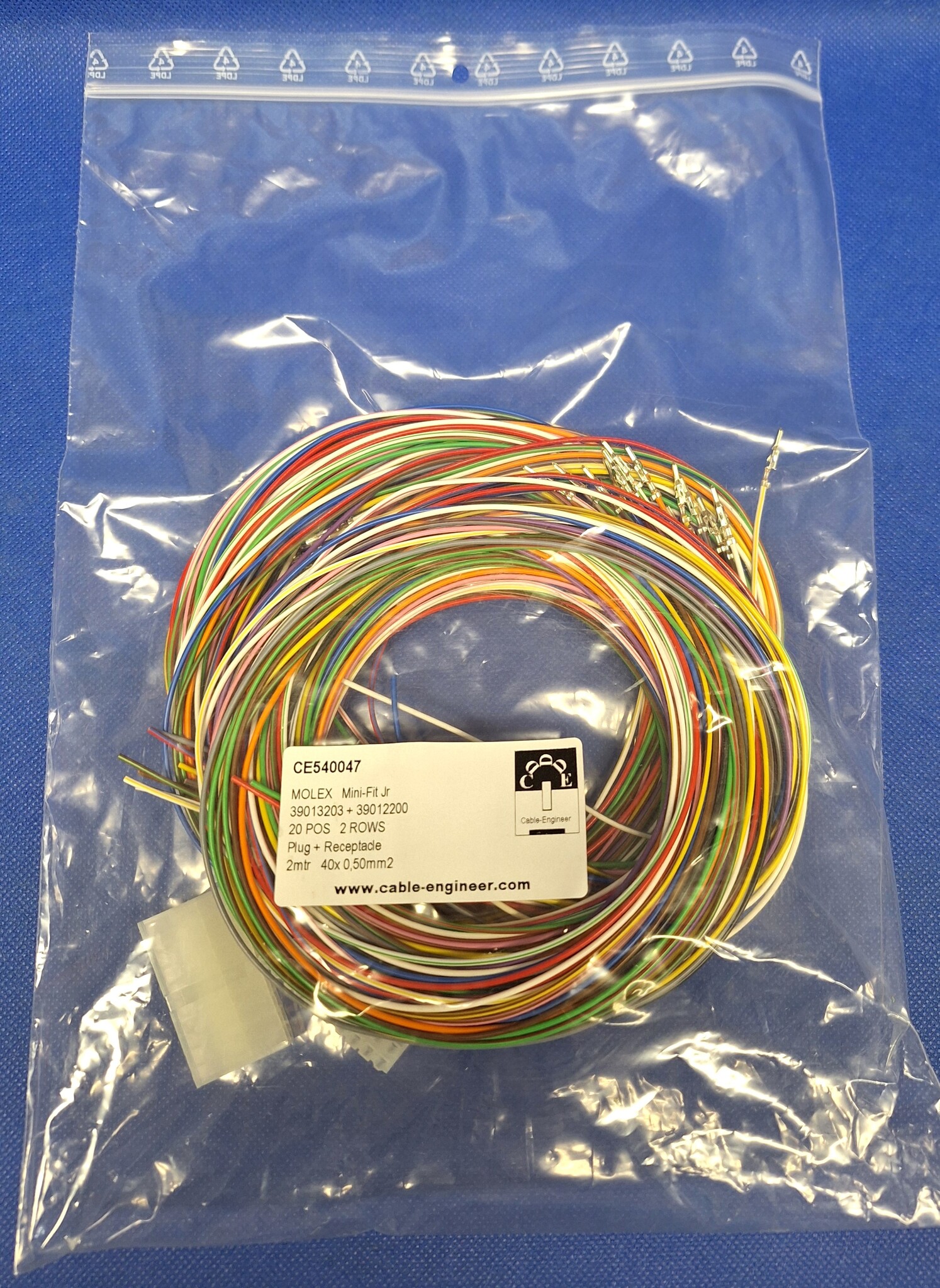 Complete set met Molex MiniFit Jr. Plug & Receptacle 20-Pos. (2-Rij) + 40x 2m. 0,50mm2 kabel en contacten