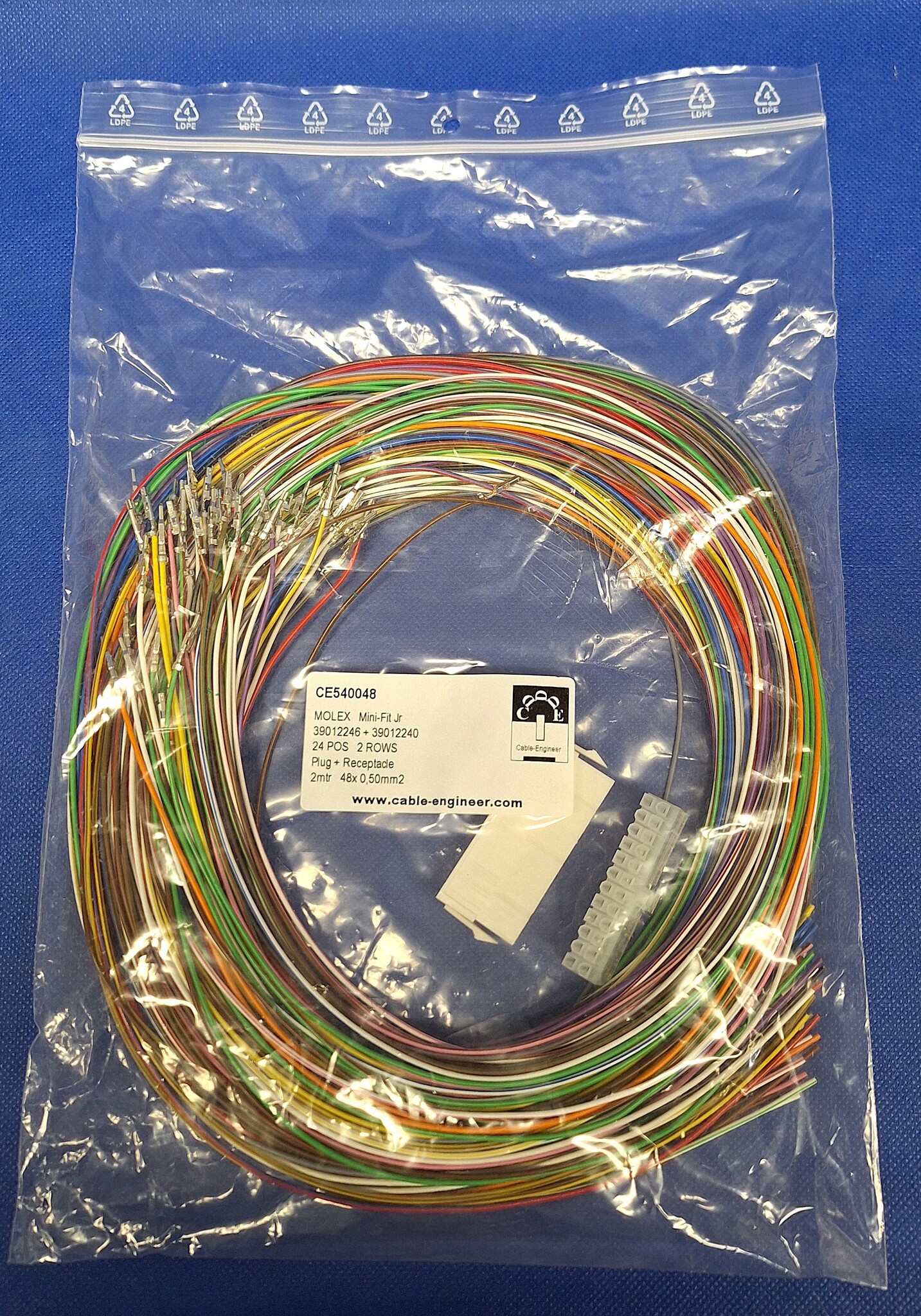 Complete set met Molex MiniFit Jr. Plug & Receptacle 24-Pos. (2-Rij) + 48x 2m. 0,50mm2 kabel en contacten
