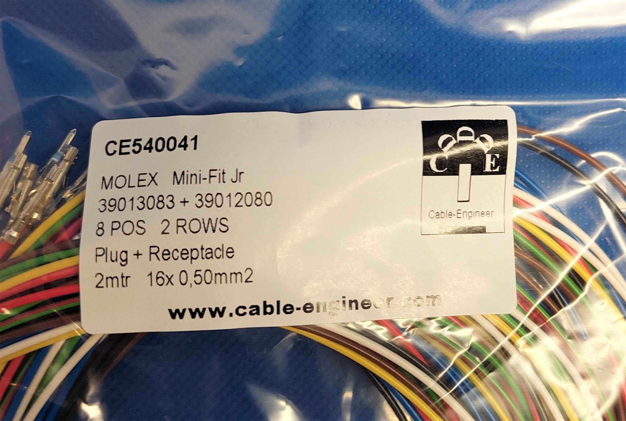 Complete sets uit eigen fabriek met originele Molex MiniFit Jr. connectoren, pre-crimped contacten en professionele 0,50 mm2 FLRY-B flexibele voertuigkabel. De sets zijn 100% gecontroleerd en getest en direct klaar voor gebruik. De kabel met contacten laten wij met opzet los in de verpakking zitten zodat je zelf de volgorde of positie van de gekleurde kabel kan bepalen.