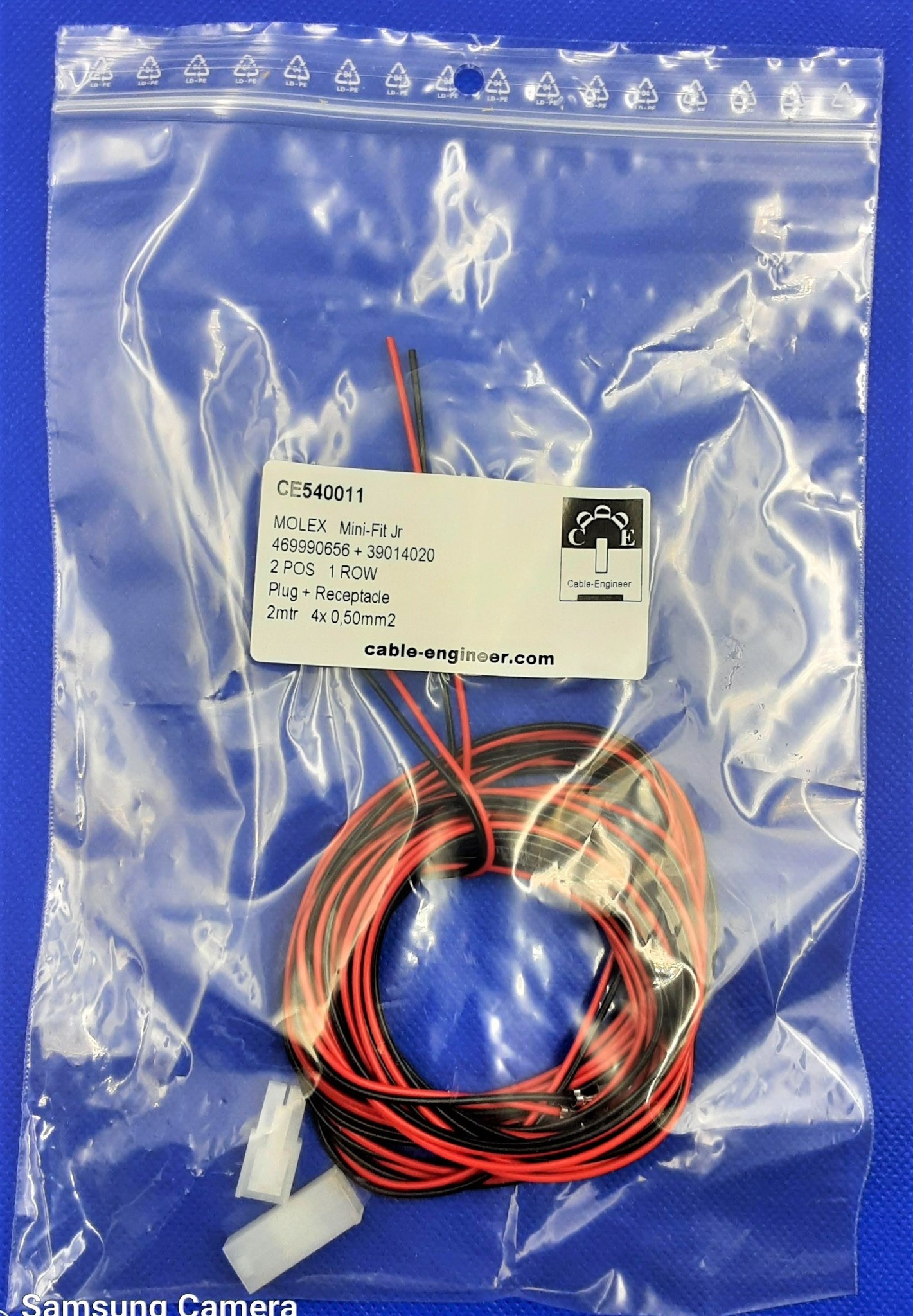Complete set met Molex Mini-Fit Jr. Plug & Receptacle 2Pos. (1-Rij) + 4x 2m. 0,50mm2 kabel en contacten (pre-crimped)