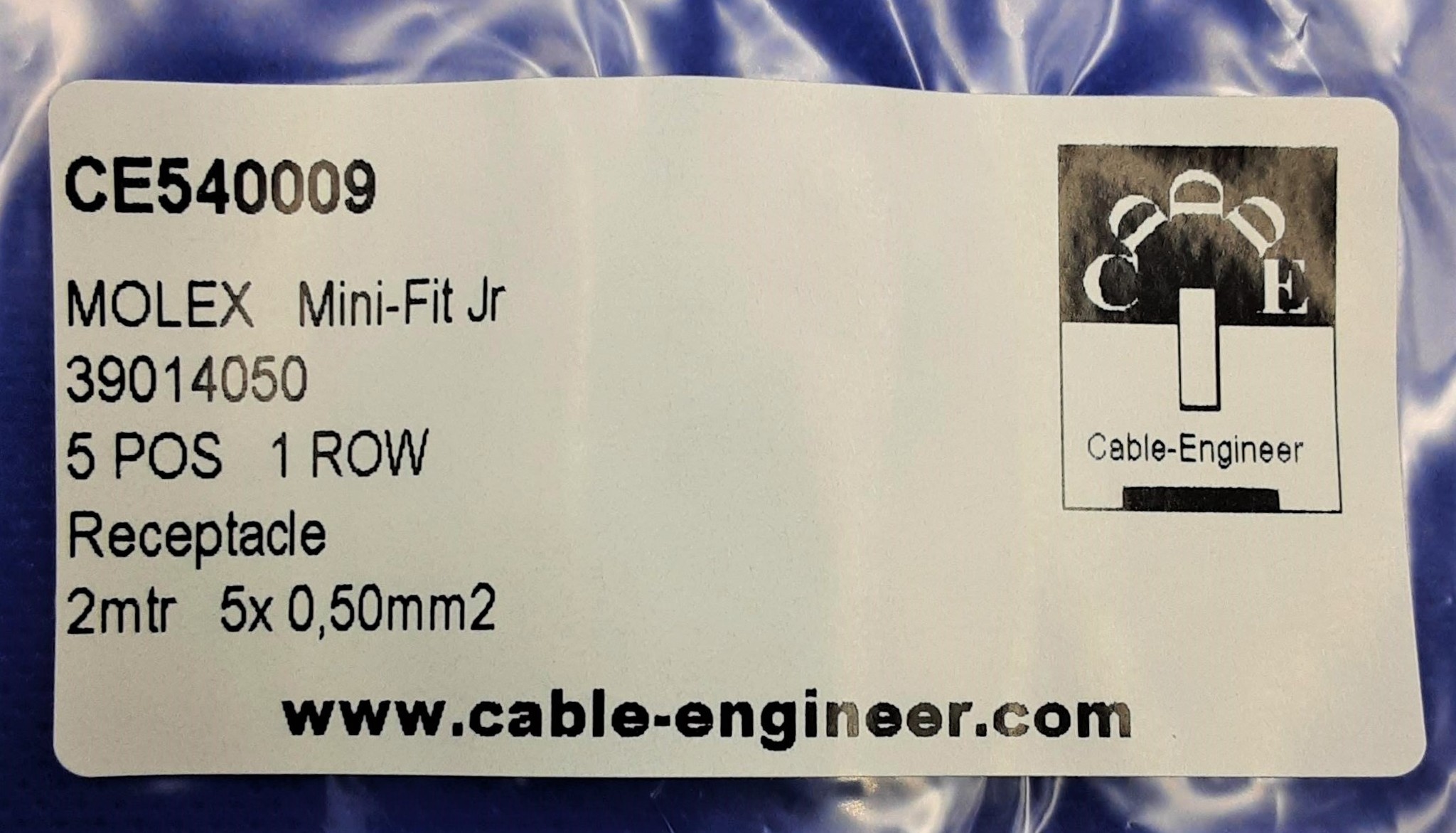 - 5x Molex Mini-Fit Jr. contact (0039000038) professioneel bevestigd aan boven genoemde kabel