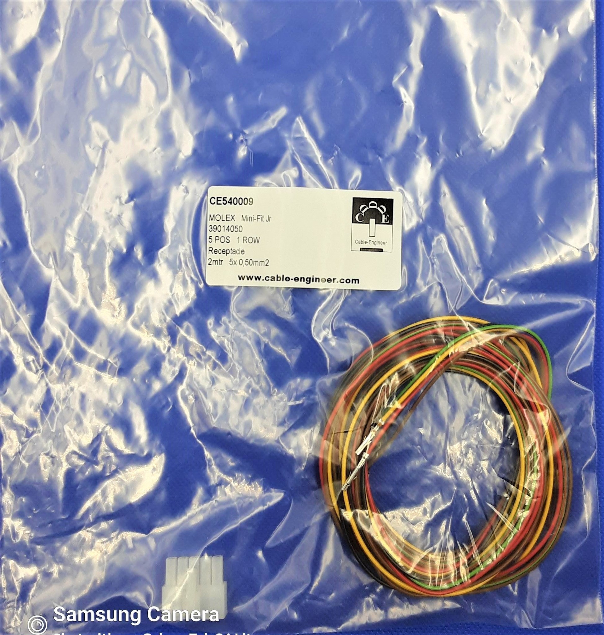 Complete set met Molex Mini-Fit Jr. Receptacle connector 5Pos.(1-Rij) + 5x 2m. 0,50mm2 kabel met contacten (pre-crimped)