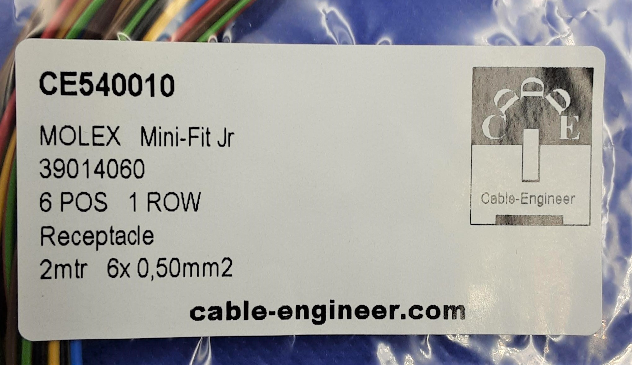 - 6x Molex Mini-Fit Jr. contact (0039000038) professioneel bevestigd aan boven genoemde kabel