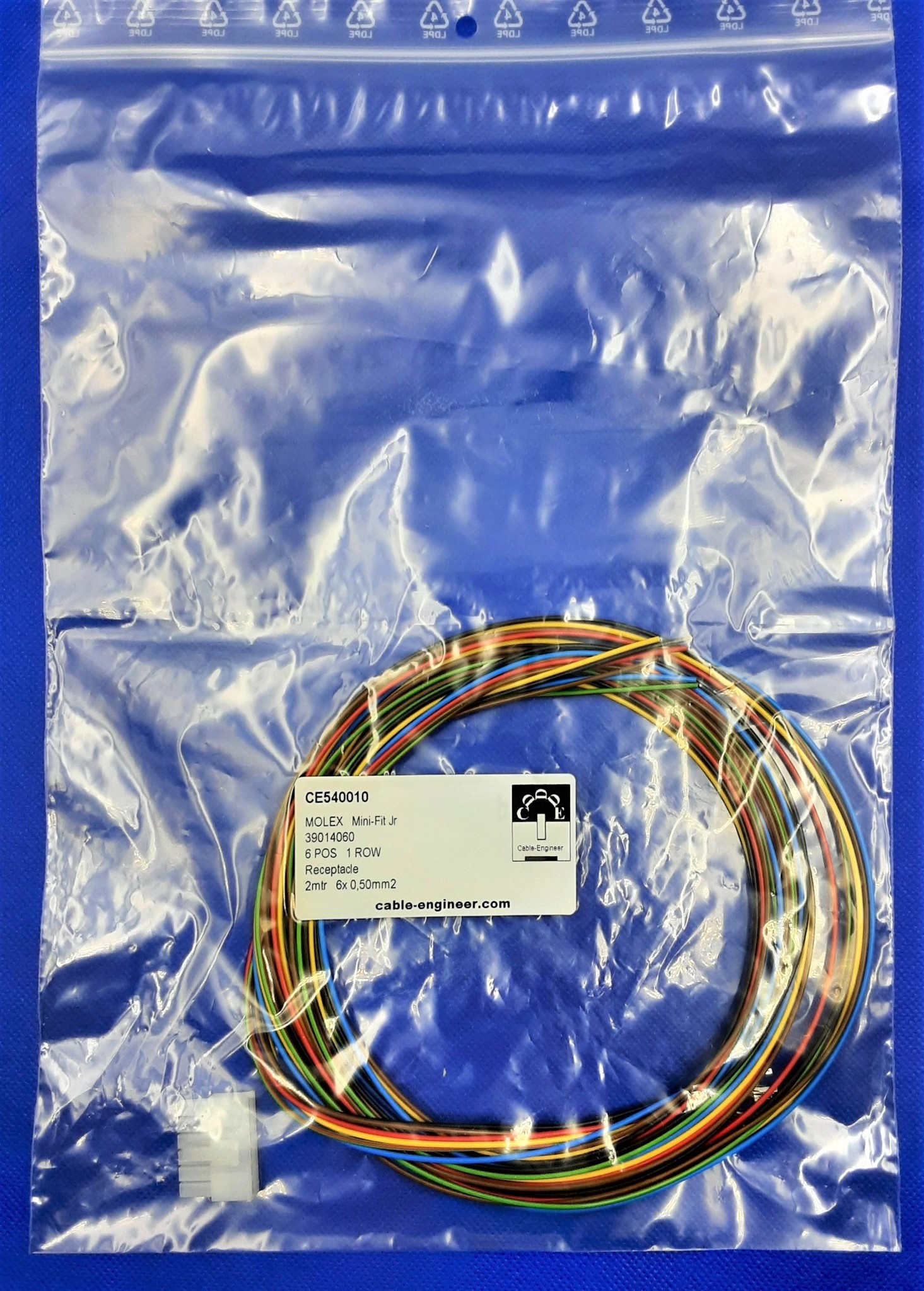Complete set met Molex Mini-Fit Jr. Receptacle connector 6Pos. (1-Rij) + 6x 2m. 0,50mm2 kabel en contacten (pre-crimped)