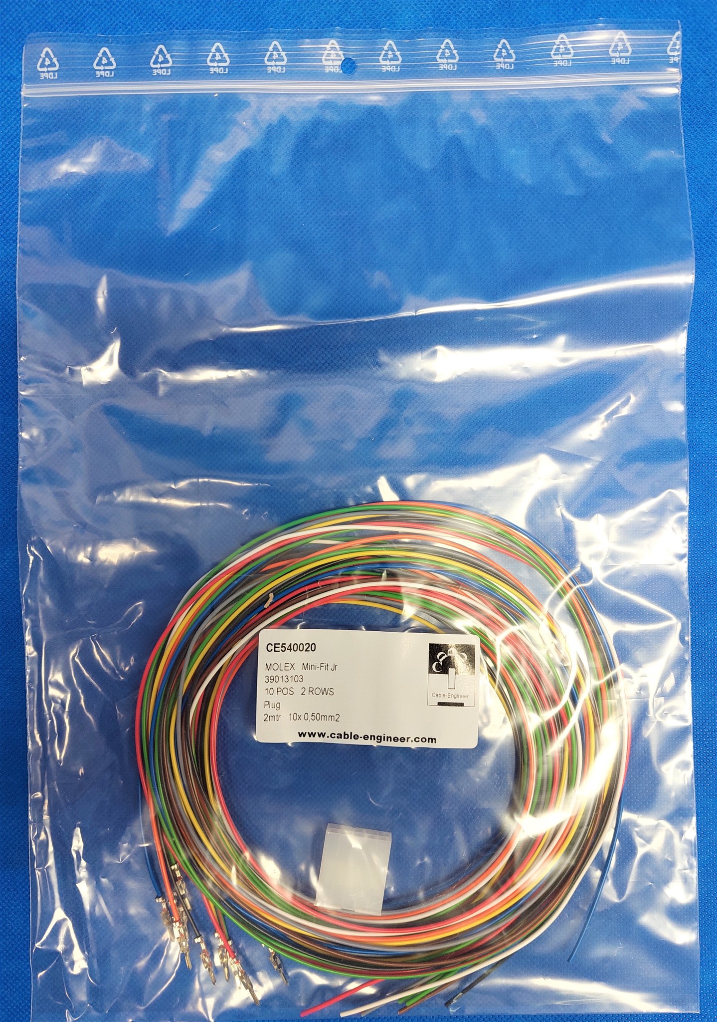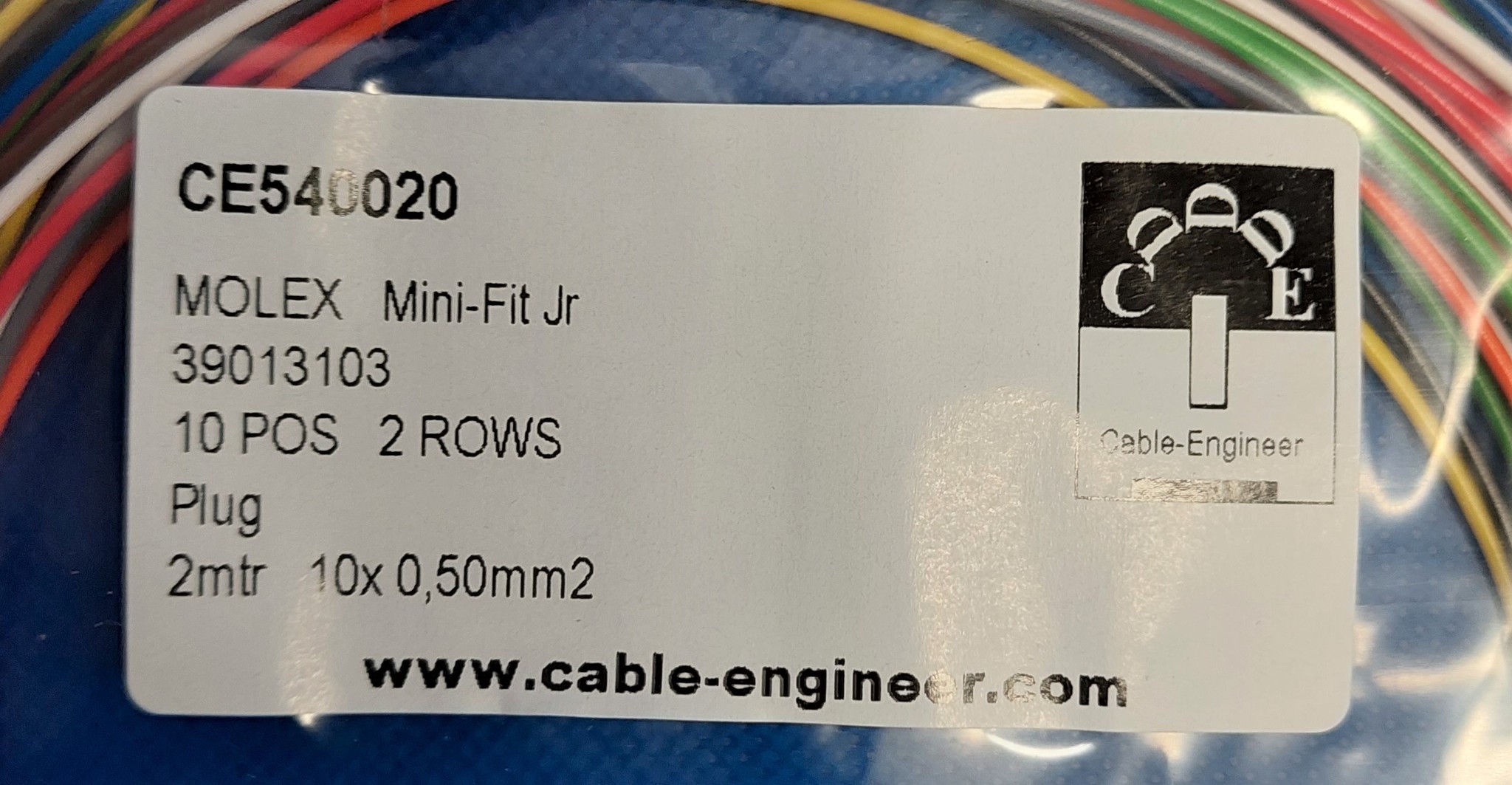 Complete set met Molex MiniFit Jr. Plug connector 10Pos. (2-Rij) + 10x 2m. 0,50mm2 kabel met contacten (pre-crimped)