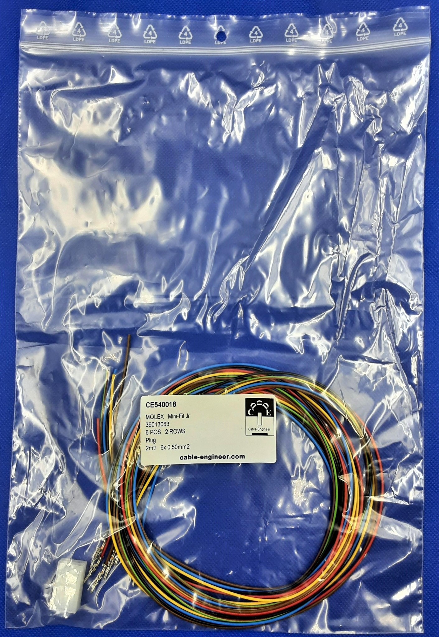 Complete set met Molex MiniFit Jr. Plug connector 6Pos. (2-Rij) + 6x 2m. 0,50mm2 kabel met contacten (pre-crimped)