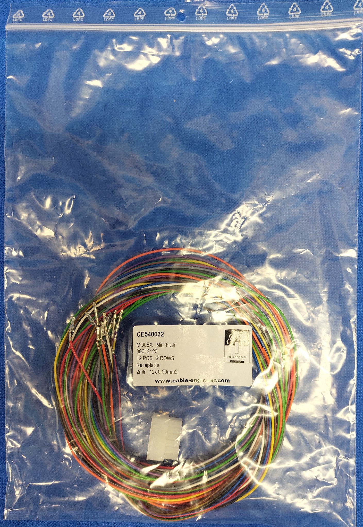 Complete set met Molex MiniFit Jr. Receptacle connector 12-Pos. (2-Rij) + 12x 2m. 0,50mm2 kabel met contacten (pre-crimped)