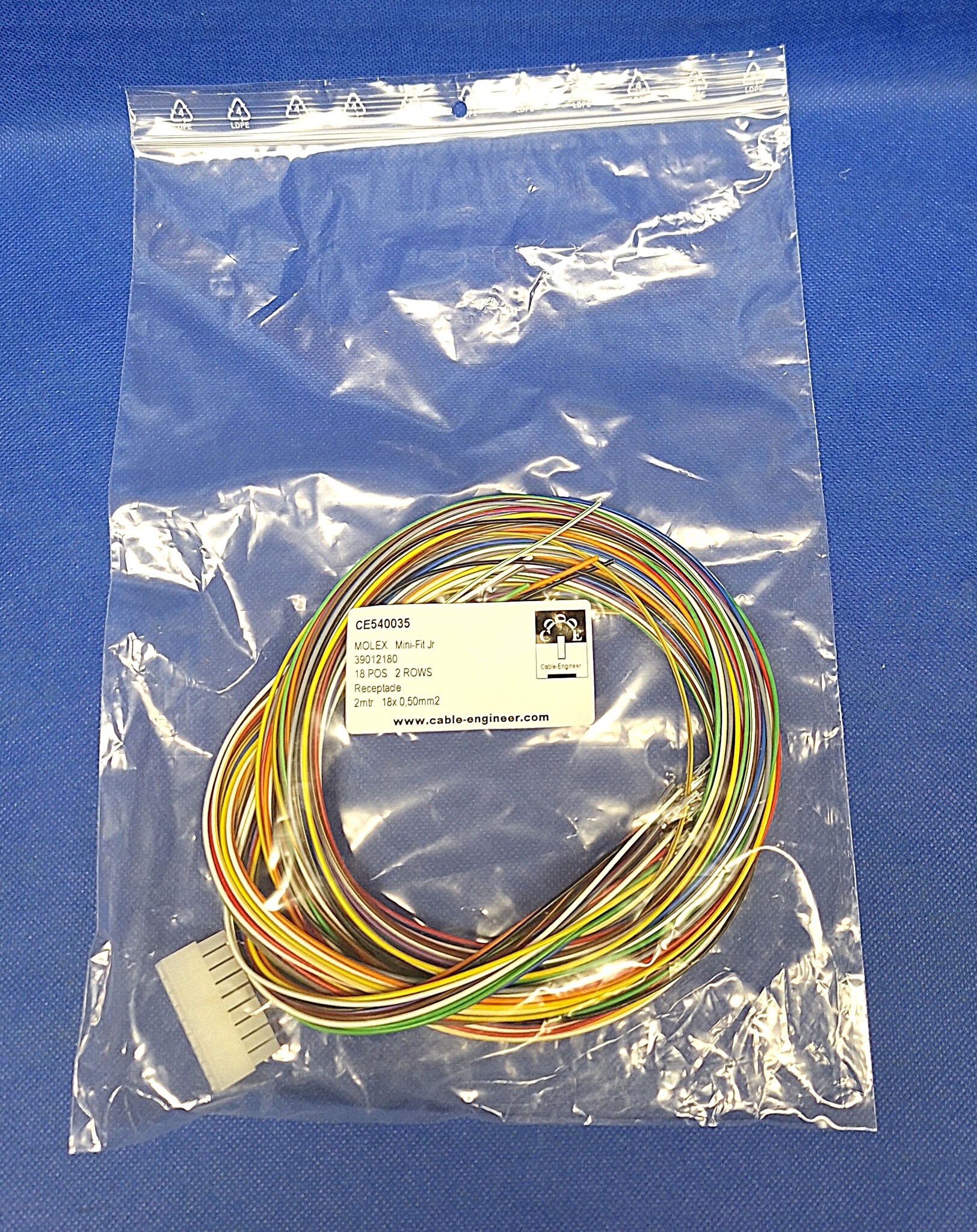 Complete set met Molex MiniFit Jr. Receptacle connector 18-Pos. (2-Rij) + 18x 2m. 0,50mm2 FLRY-B kabel met contacten (pre-crimped)