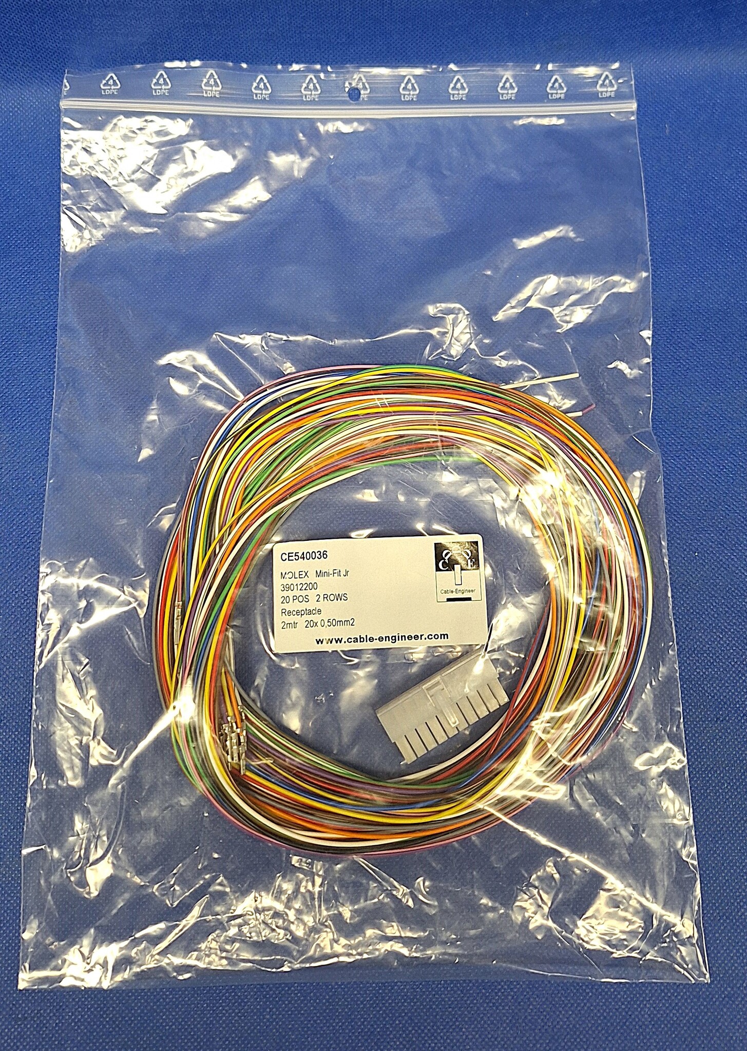 Complete set met Molex MiniFit Jr. Receptacle connector 20-Pos. (2-Rij) + 20x 2m. 0,50mm2 FLRY-B kabel met contacten (pre-crimped)